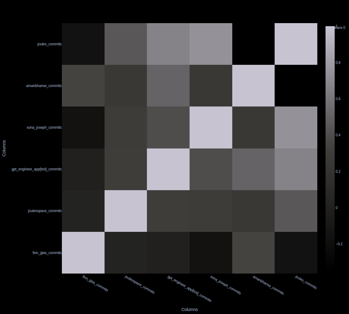 The plot shows the correlation between teammates contributions to the codebase. To the right, you see the black-and-white scale ranging from slightly below 0 (not correlated / inversely correlated) to 1 (meaning exactly equal workload). If you check the gpt-engineer row, you can see it is correlated with every team member except Finn. This is because he did not like the tool and thus did not use it. Aman and Finn seem to have a high correlation, as well as well as Sona and Joules (Julias github account). That "Joules" is Julias github account results in the correlation of the daily commit counts on the two.