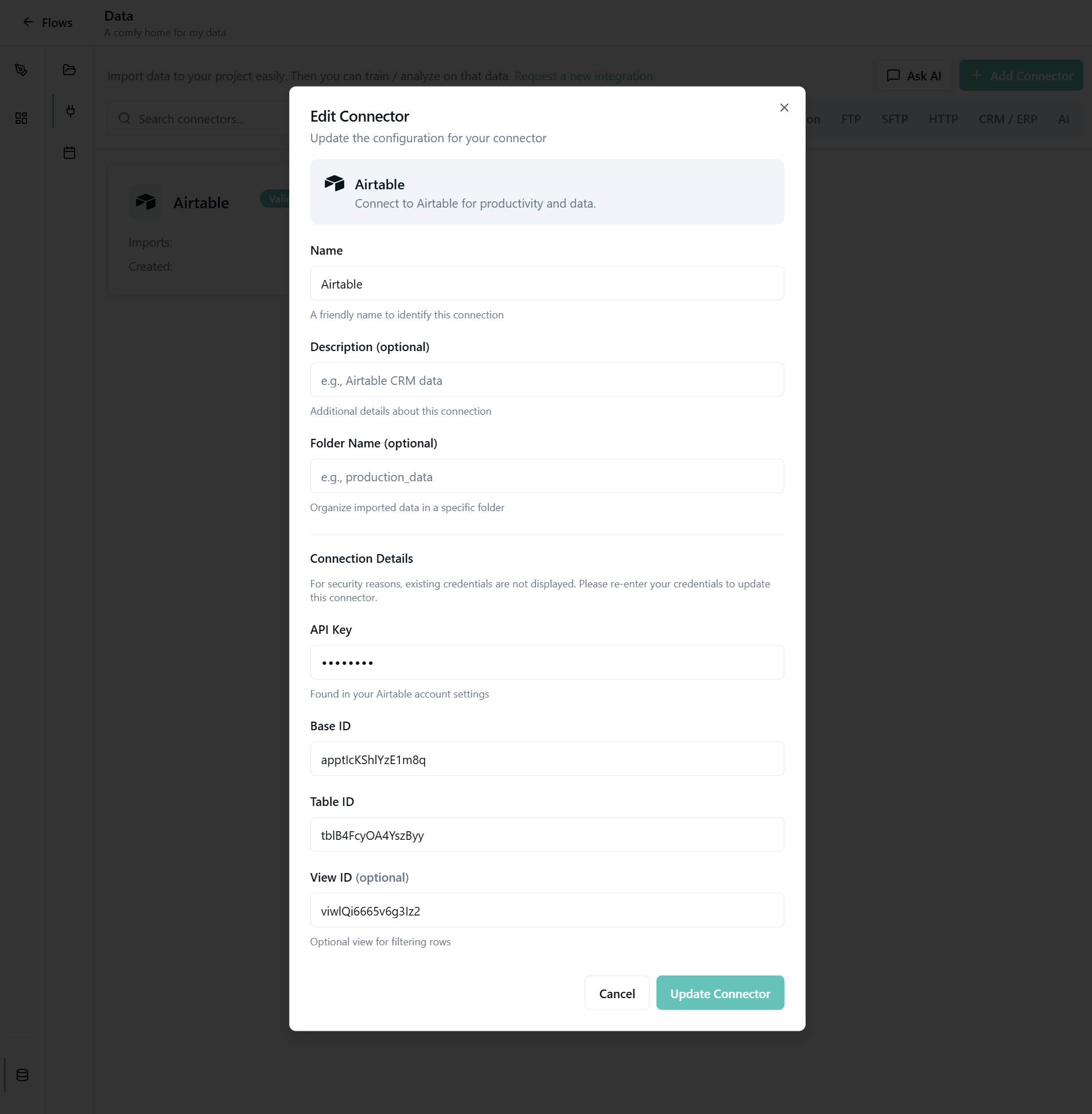 - Unified Storage: Data is stored in a standardized format for consistent use across flows and AI models