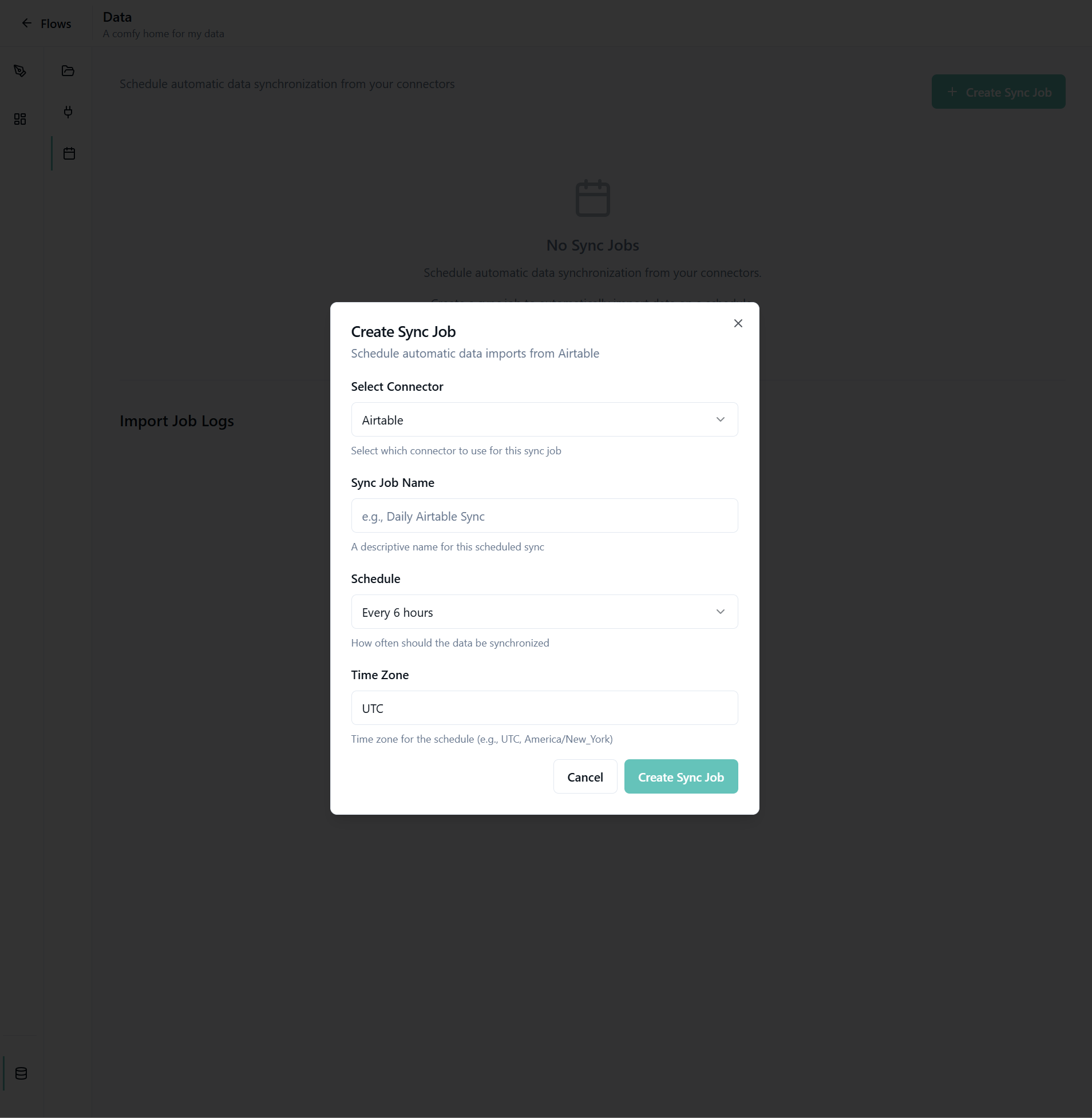 Click Create Sync Job and select the connector you created in the integrations tab from the dropdown. In our case, we created the Airtable connector.