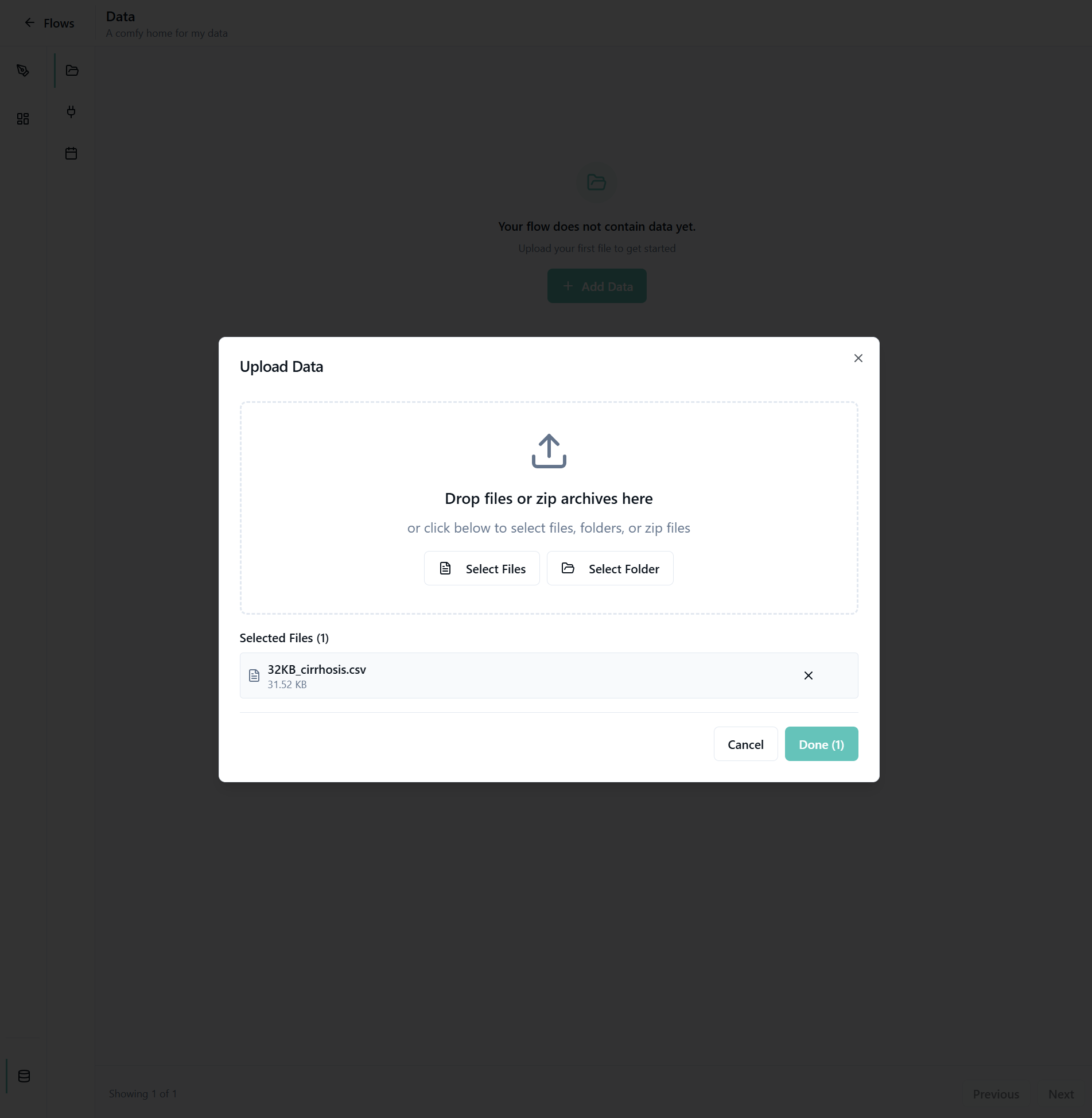 Once processing is complete, you'll see the status as "ready". The file will now be available for selection throughout the tool - in plots, flows, and for previewing.