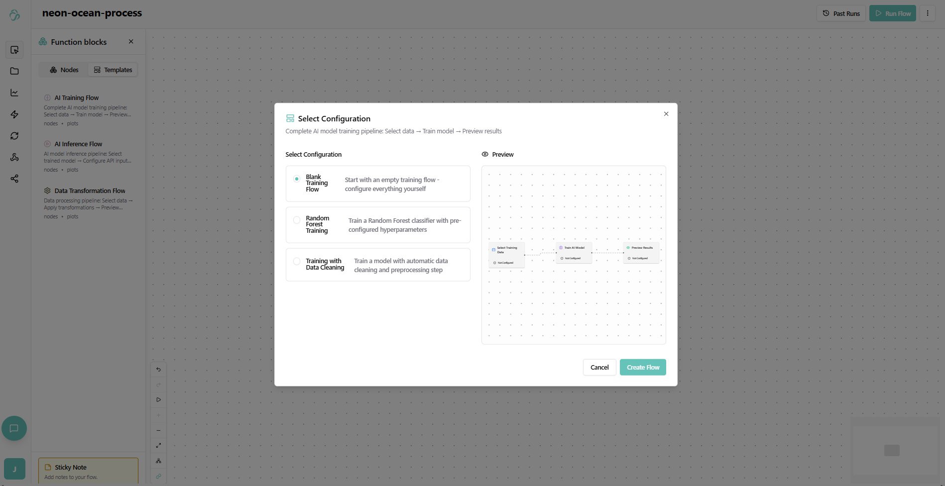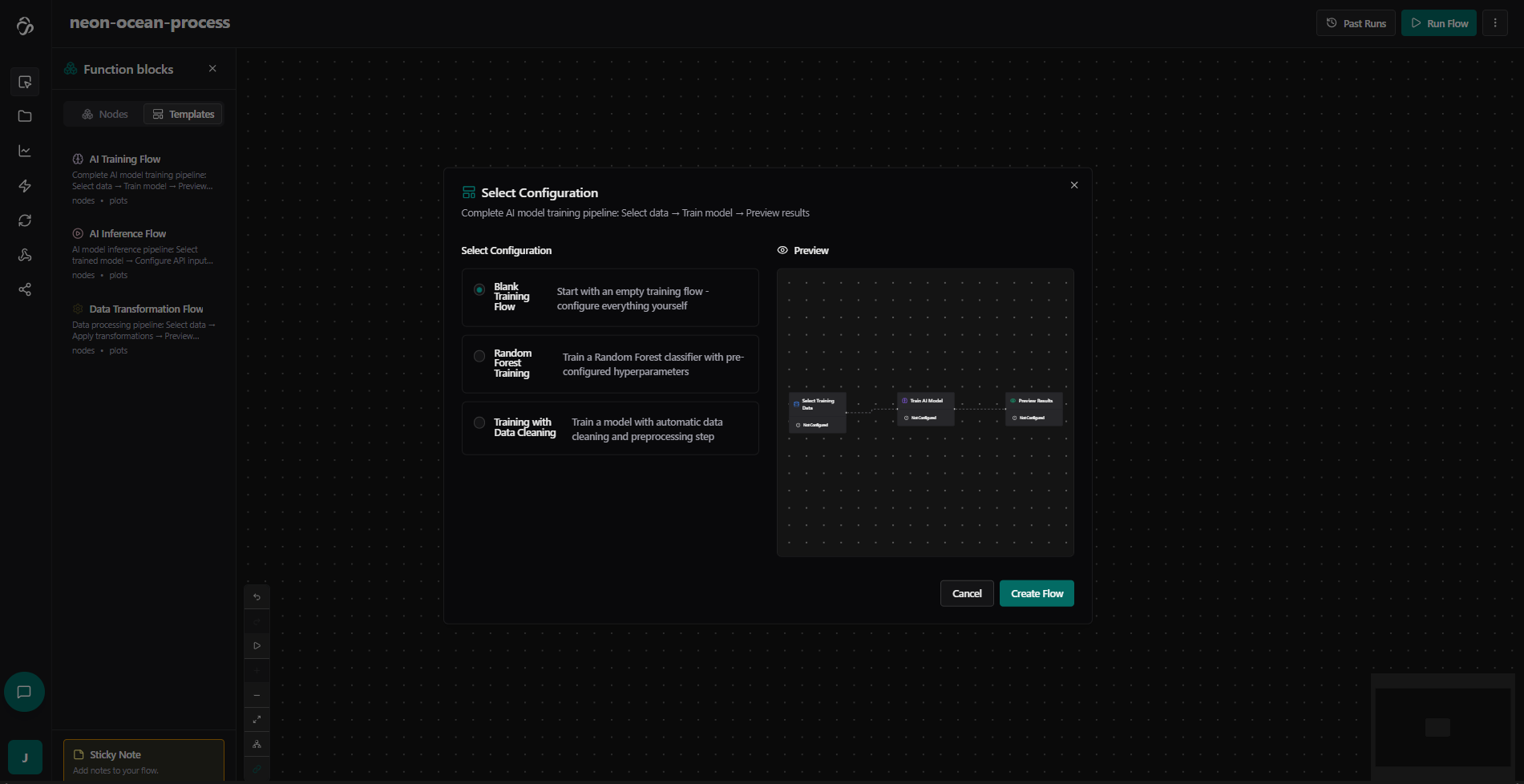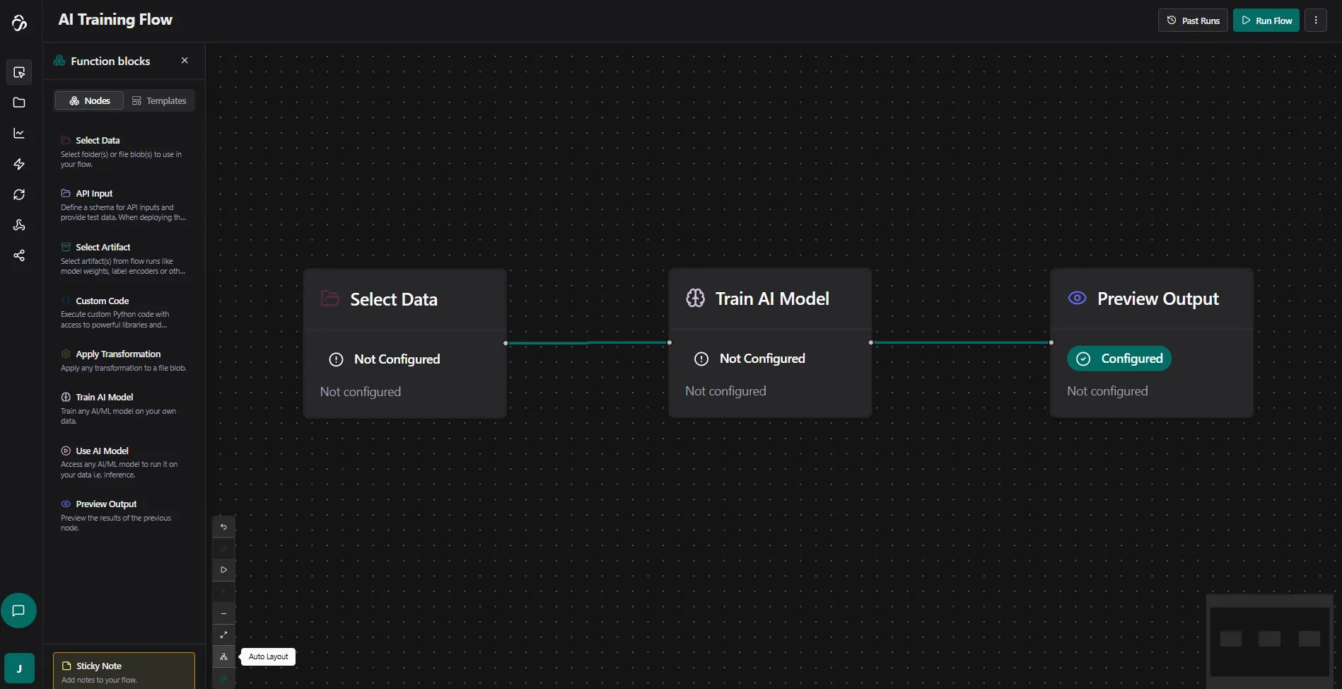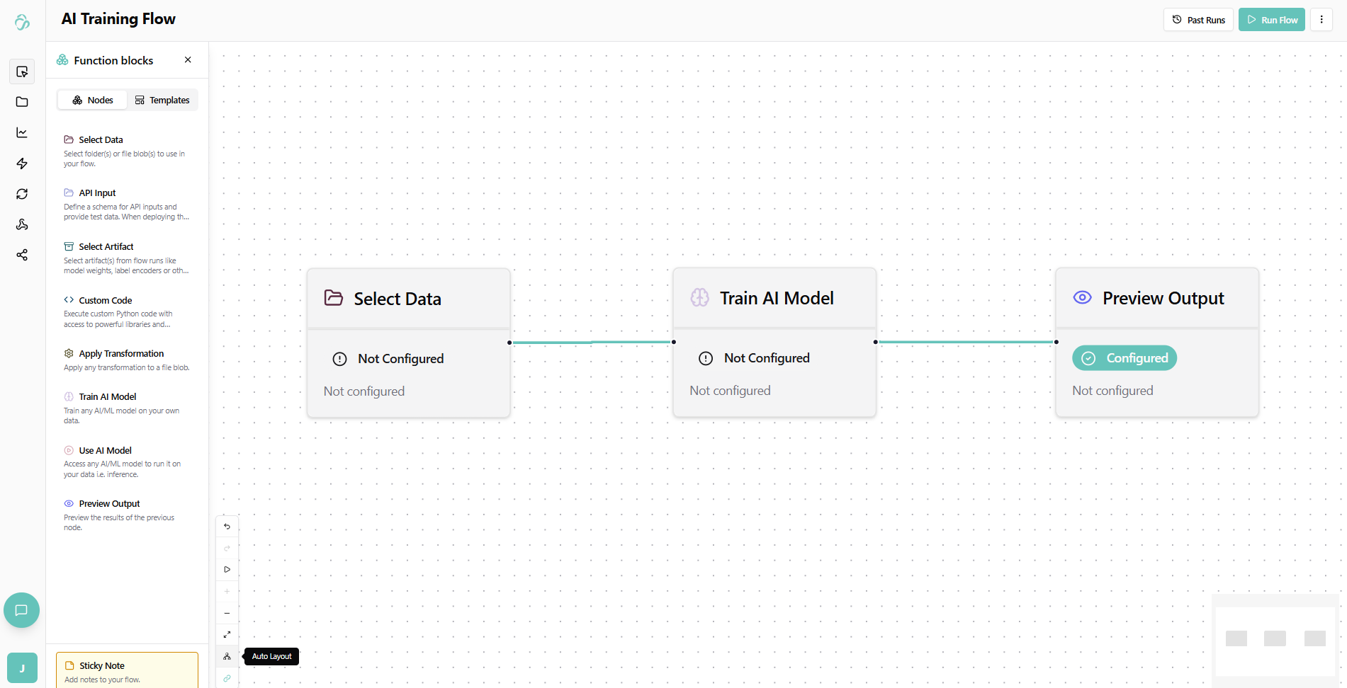 The Flow Editor is a visual, no-code/low-code tool for building powerful data pipelines and automation workflows. With pre-built blocks and AI assistance, you can create complex data processing and AI workflows without writing code.