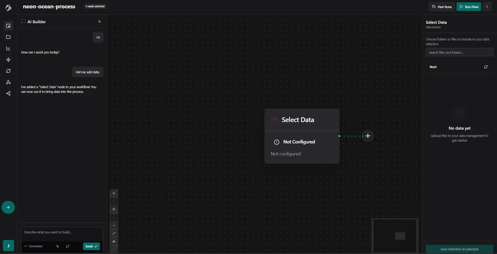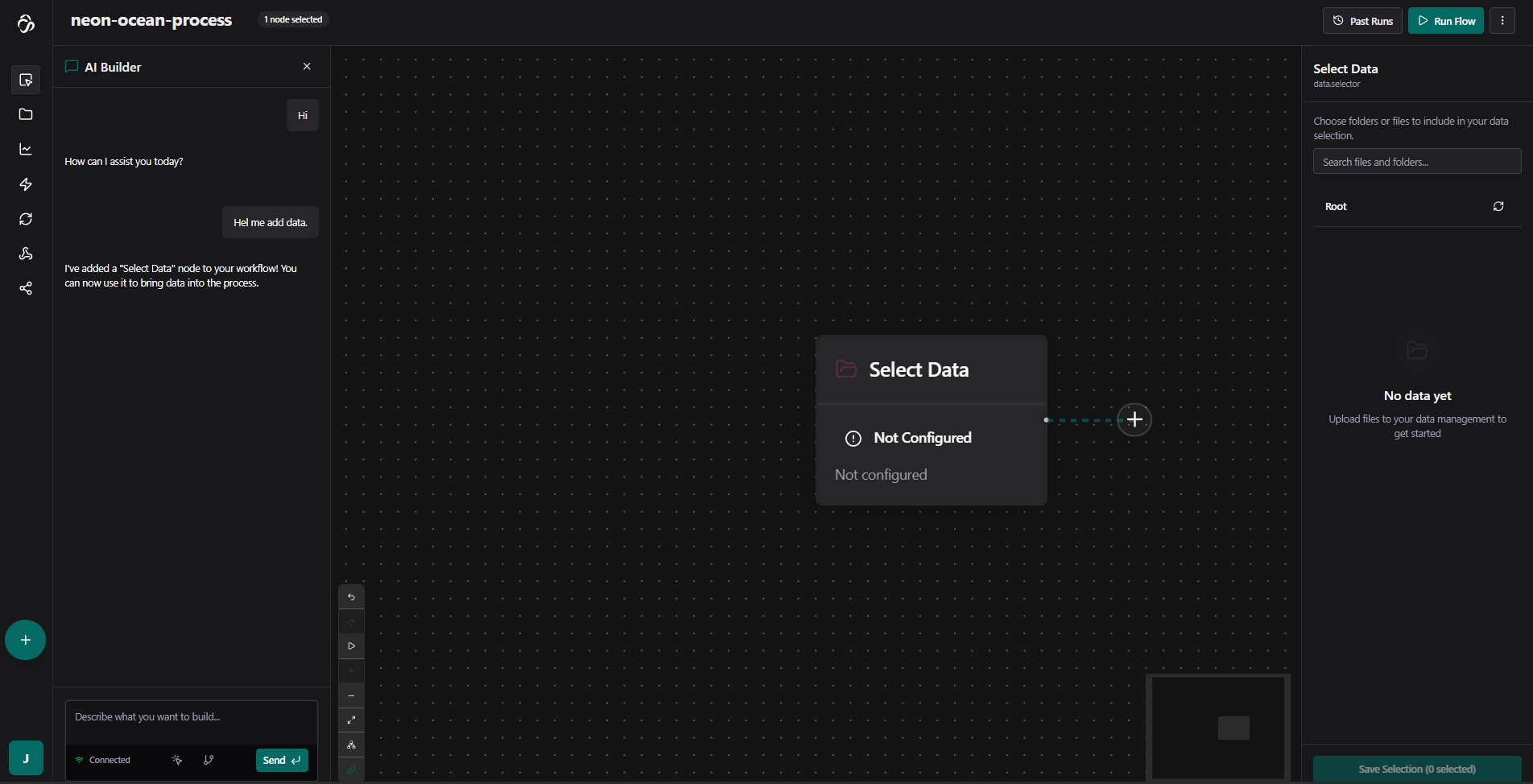 In our case we asked the chat (with a typo) if our ai builder can help us add data. The chat suggested to first add a select data node.