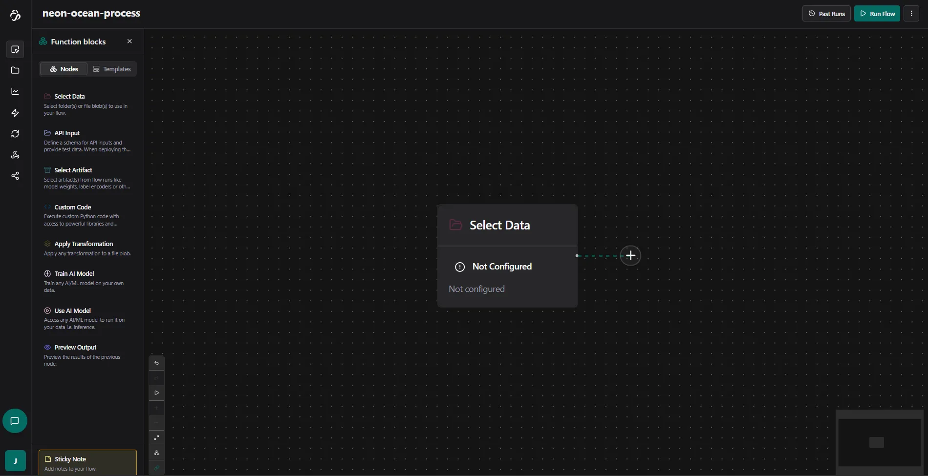 To do this manually you can open the Node Library by clicking on the Plus Icon in the Sidebar and click on the Select Data node. You can also drag the Select Data Node on the canvas. In this node (or function block) we will select what data that we use in our flow. You can add multiple select data nodes and bring the different paths together later or create other structures that you need for your project. All functions that connect to the Select Data Node will use its data.