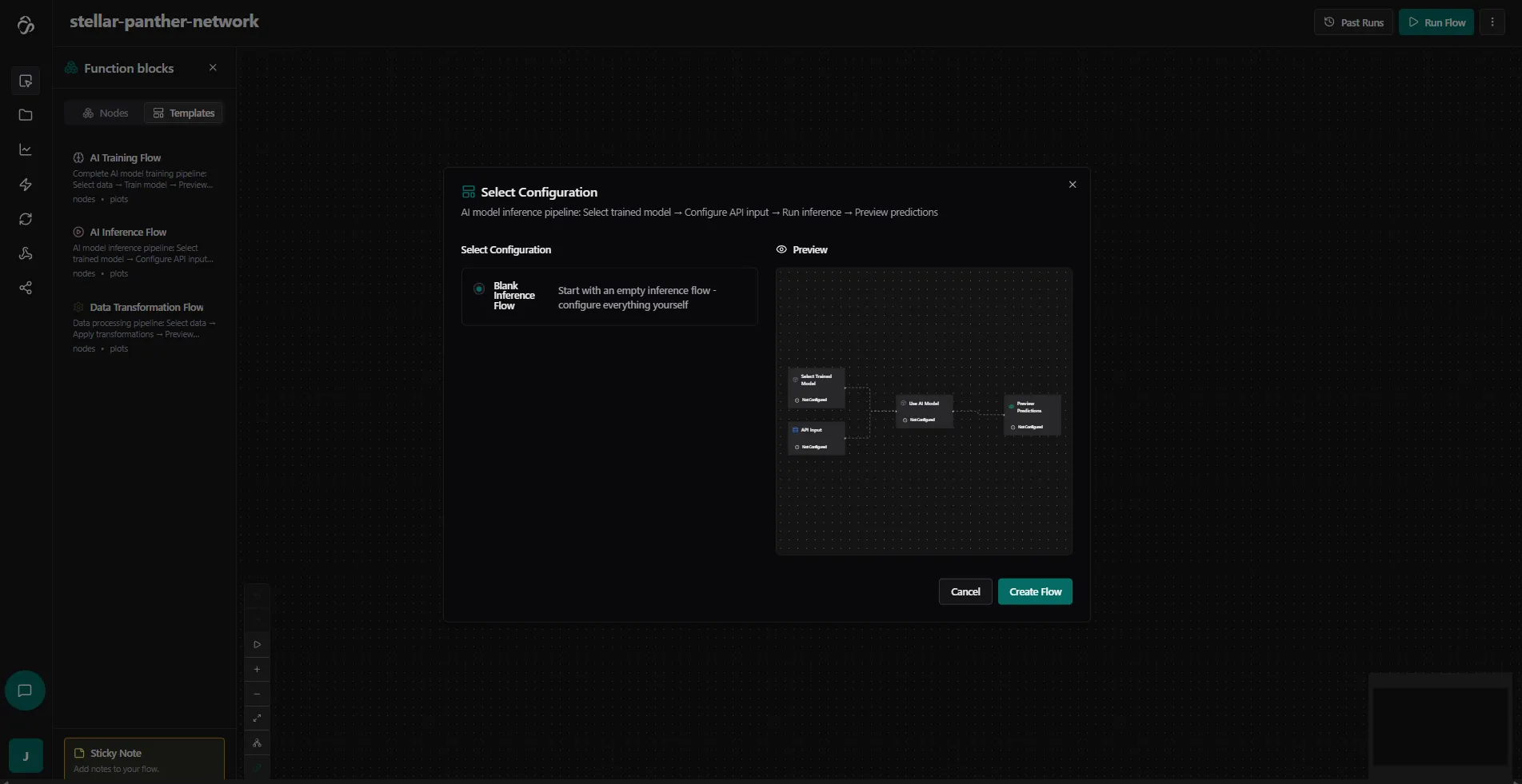 Alternatively you can add them in the chat or from an inference template. Simply select the node library, navigate to the template tab and select Ai Inference Flow. Here we are choosing the blank flow.