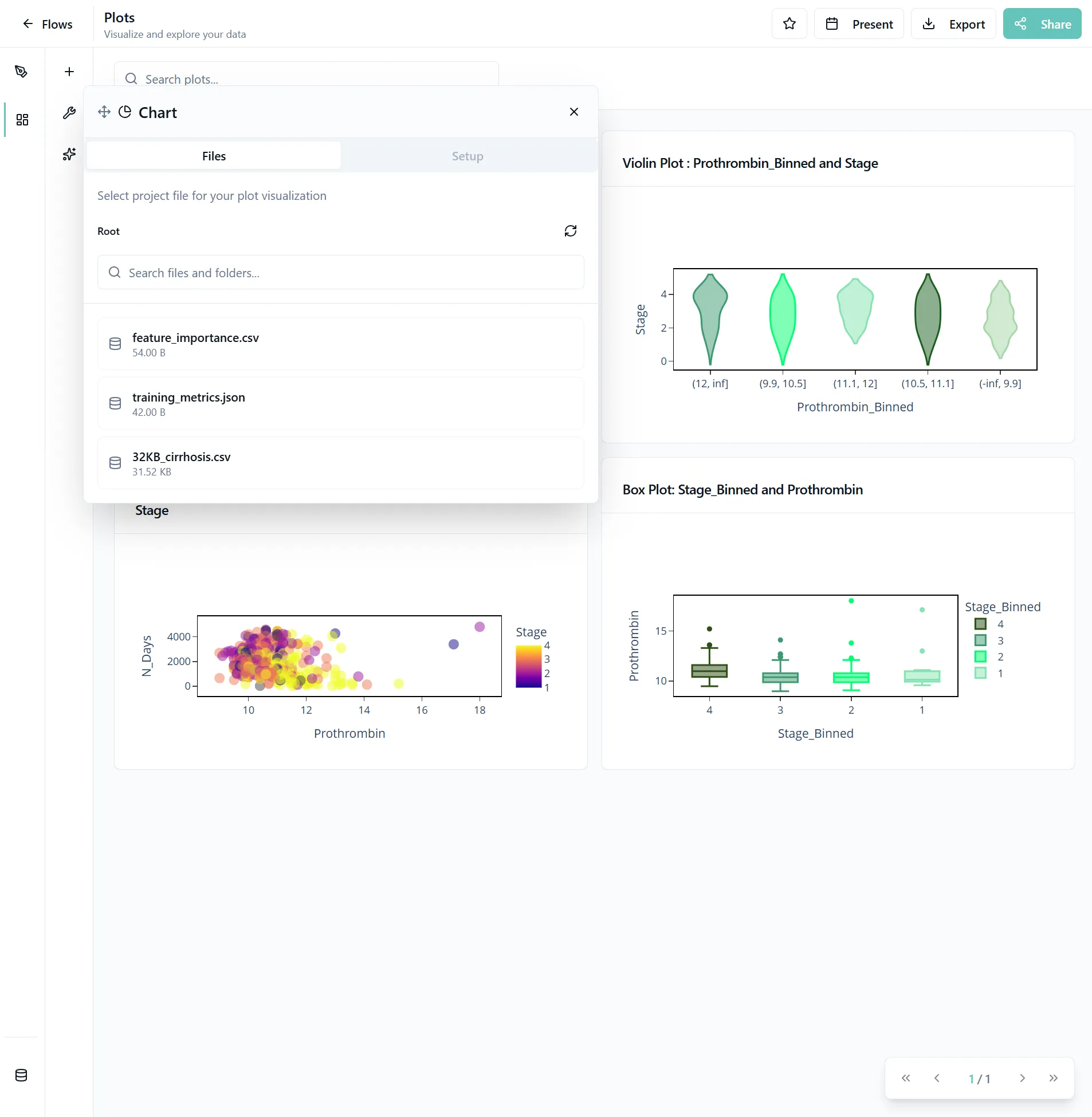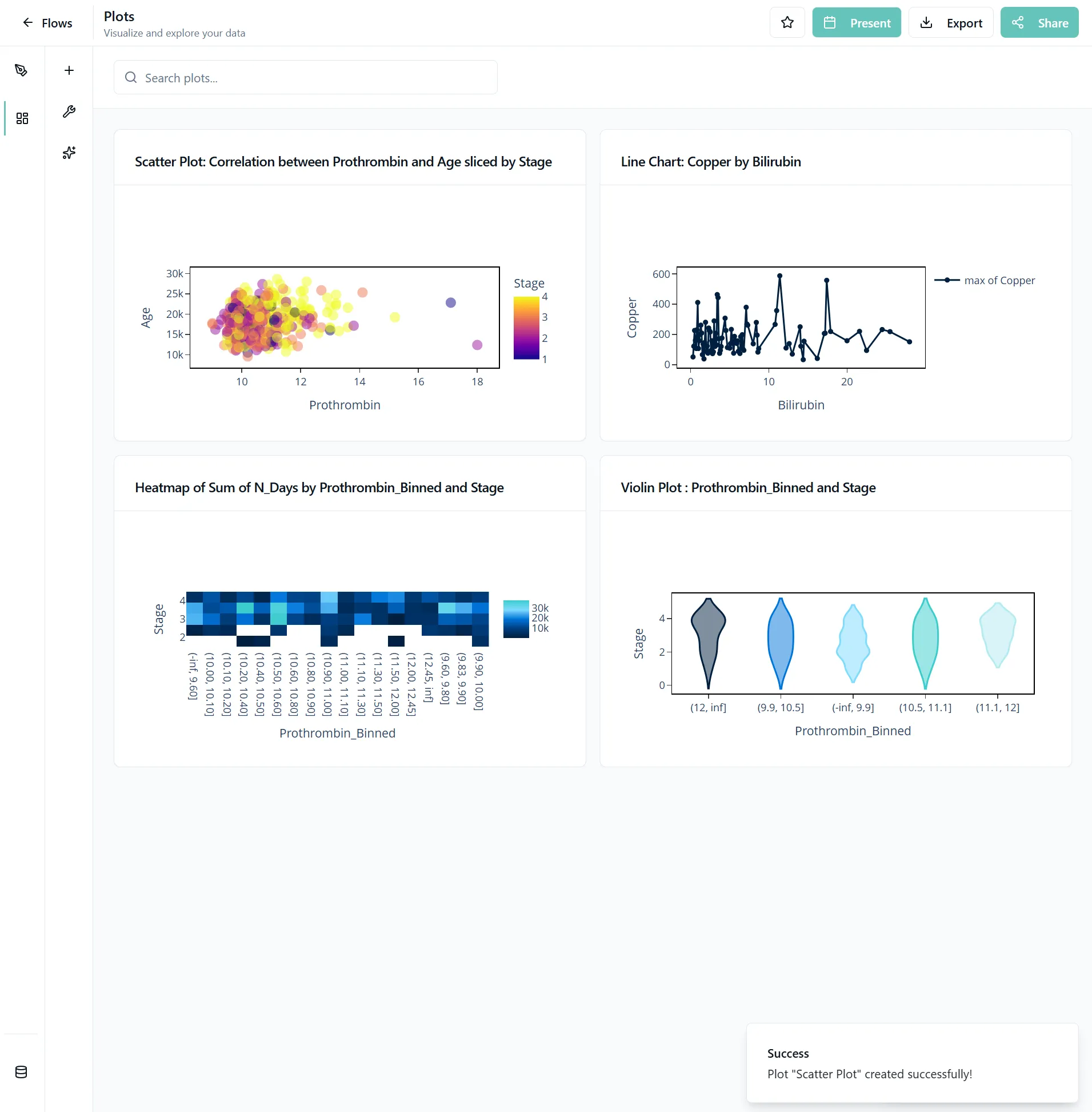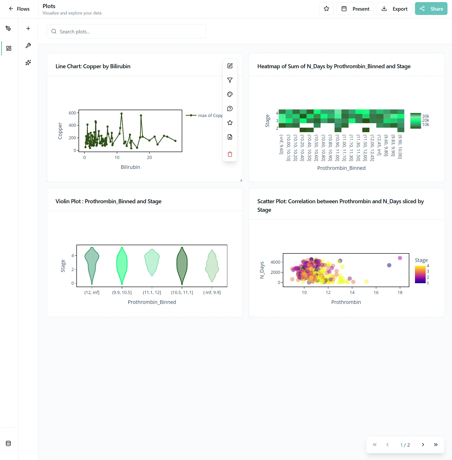 Your data gets pretty with interactive visualizations. In the background we do teh math and statistics for you to recommend teh most suitable plots. You can also activate AI agent support that runs an LLM to have a flawless experience.