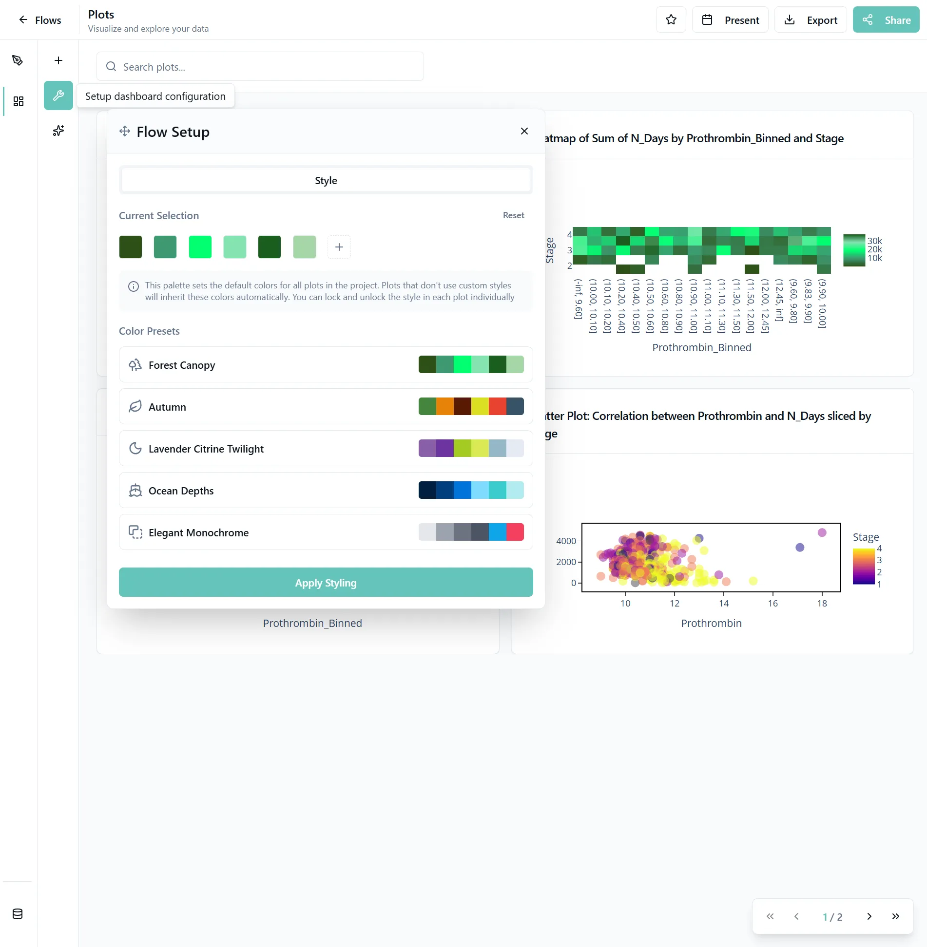 To customize colors and styling for all plots, click on the tool icon. Choose from predefined palettes like Ocean Depths, Forest Copy, and more. Depending on the number of plots, it could take a minute to apply your changes.