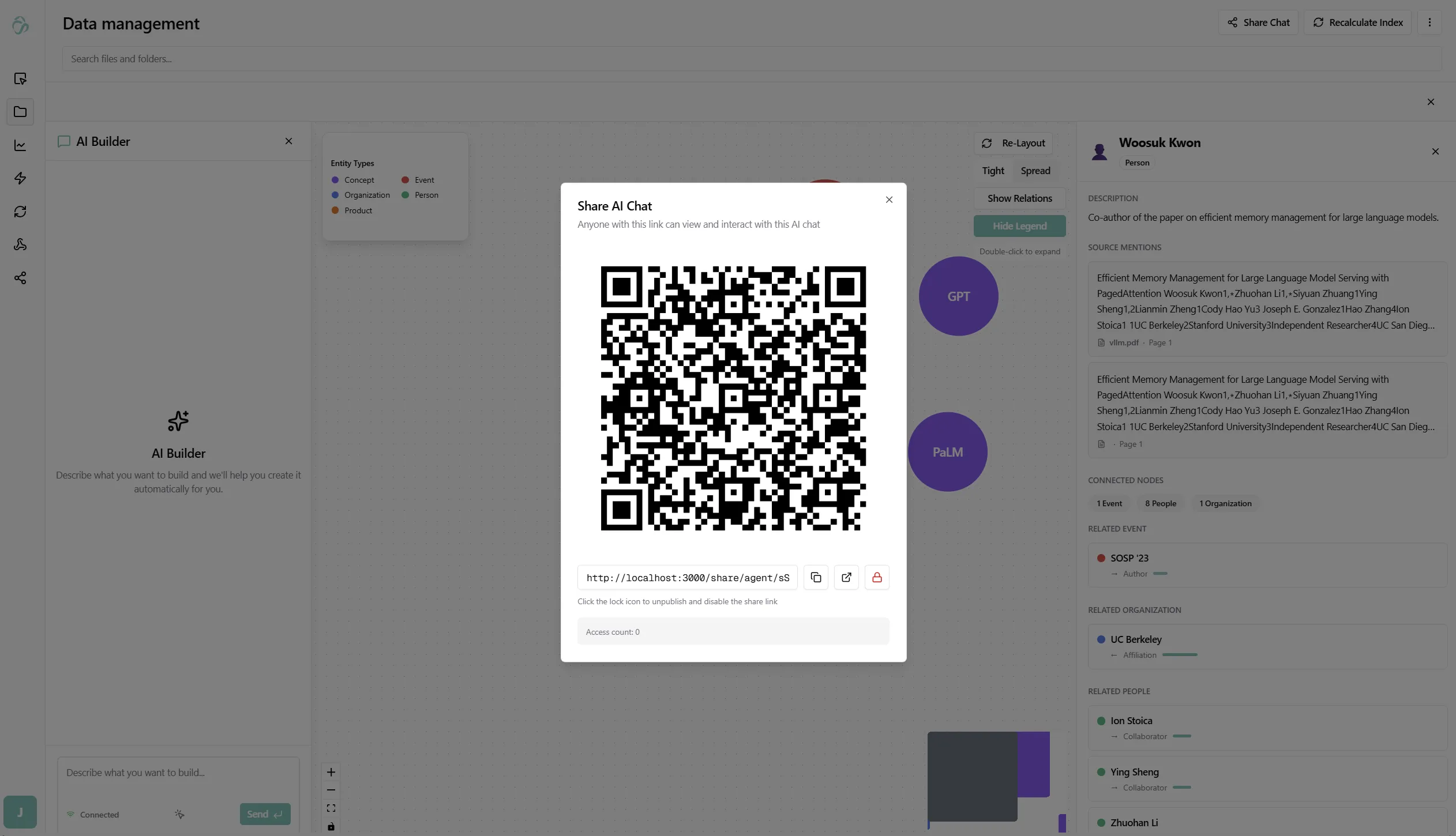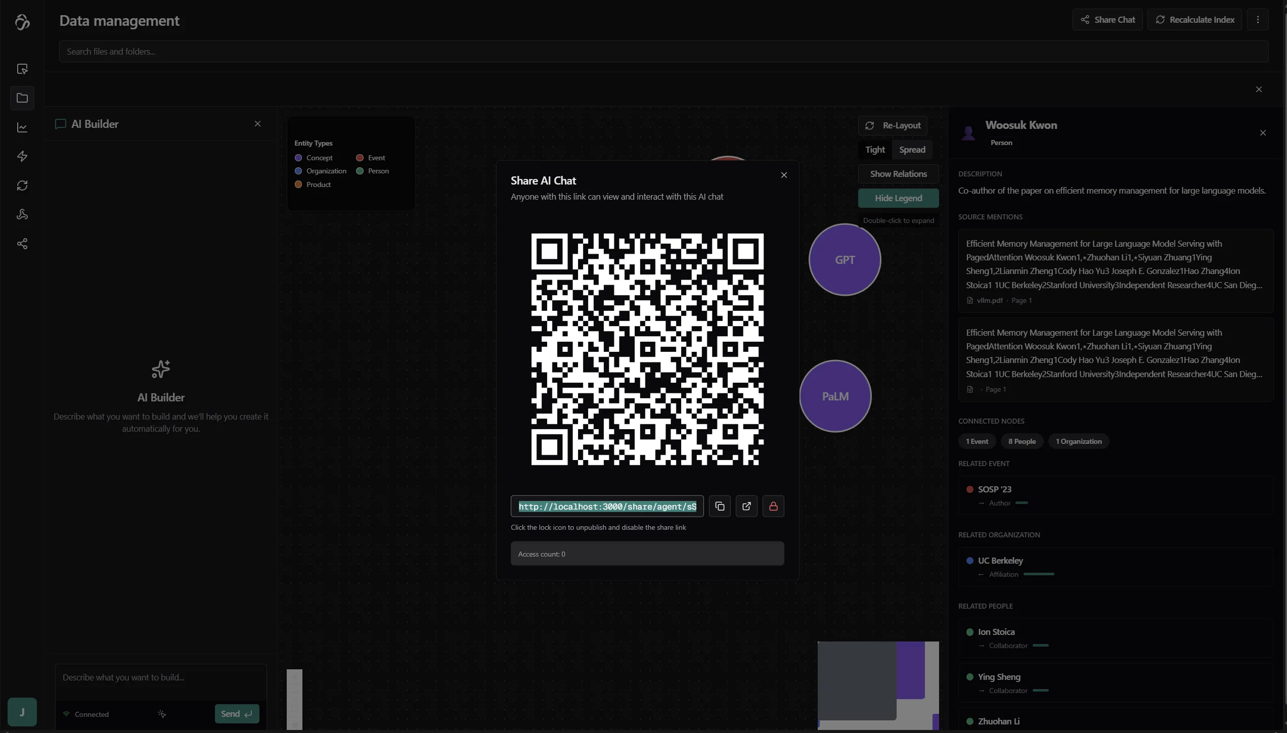 Every RAG index automatically builds a Knowledge Graph — a network of entities and relationships extracted from your documents. This lets you visually explore what your documents contain before and while asking questions.