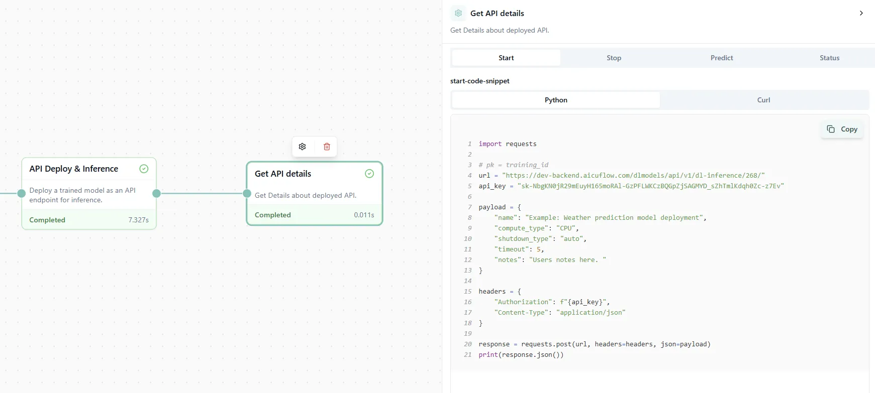 Figure 10: API deployment details with ready-to-use code examples.
