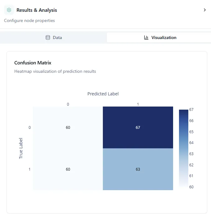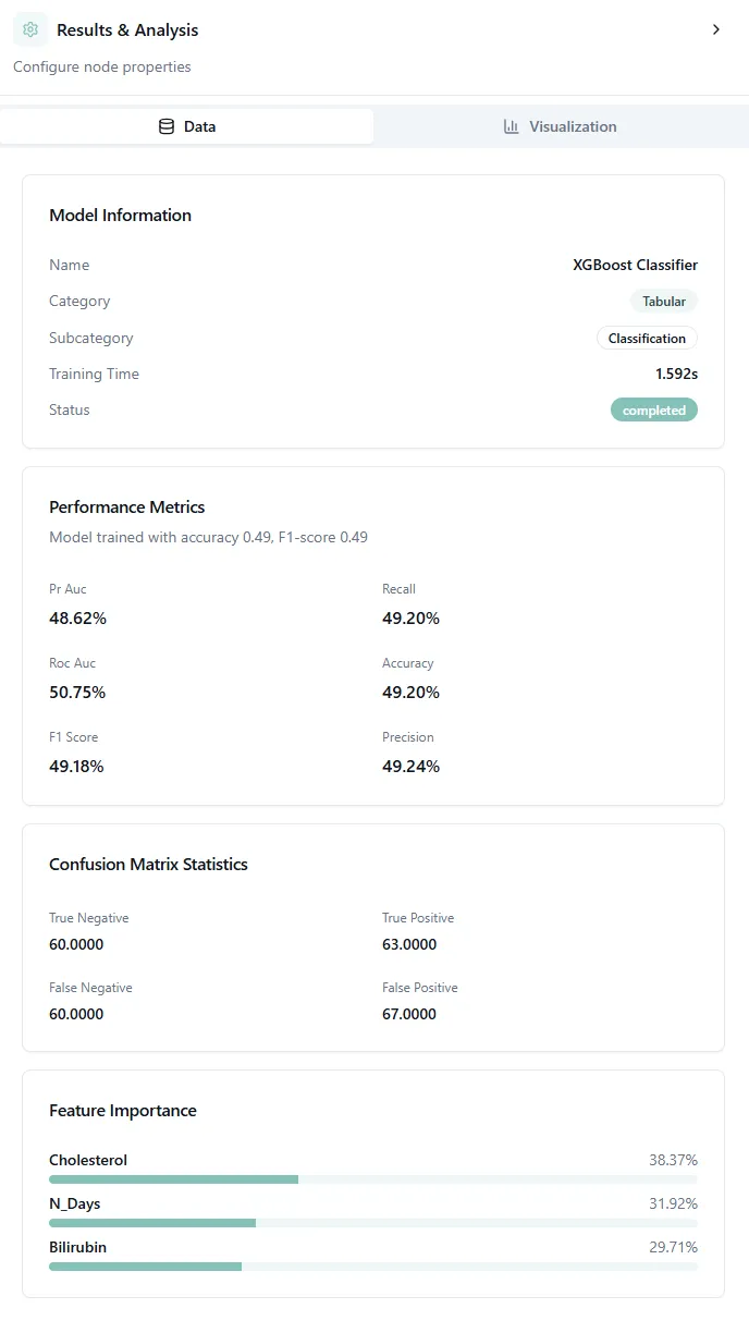 Once training is configured, add a Results & Analysis node. This node will show: