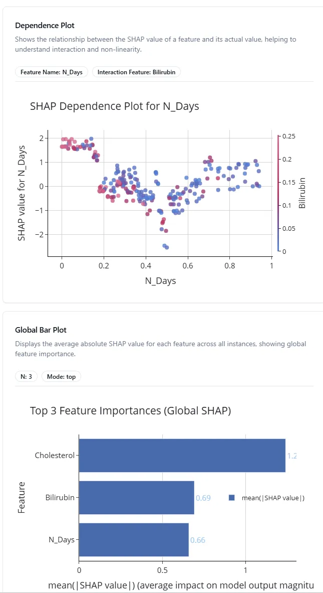 In this cirrhosis example, you might see features like bilirubin levels, albumin, or age at the top. These are the biomarkers your model relies on most when predicting disease stage.