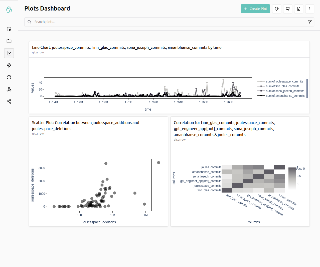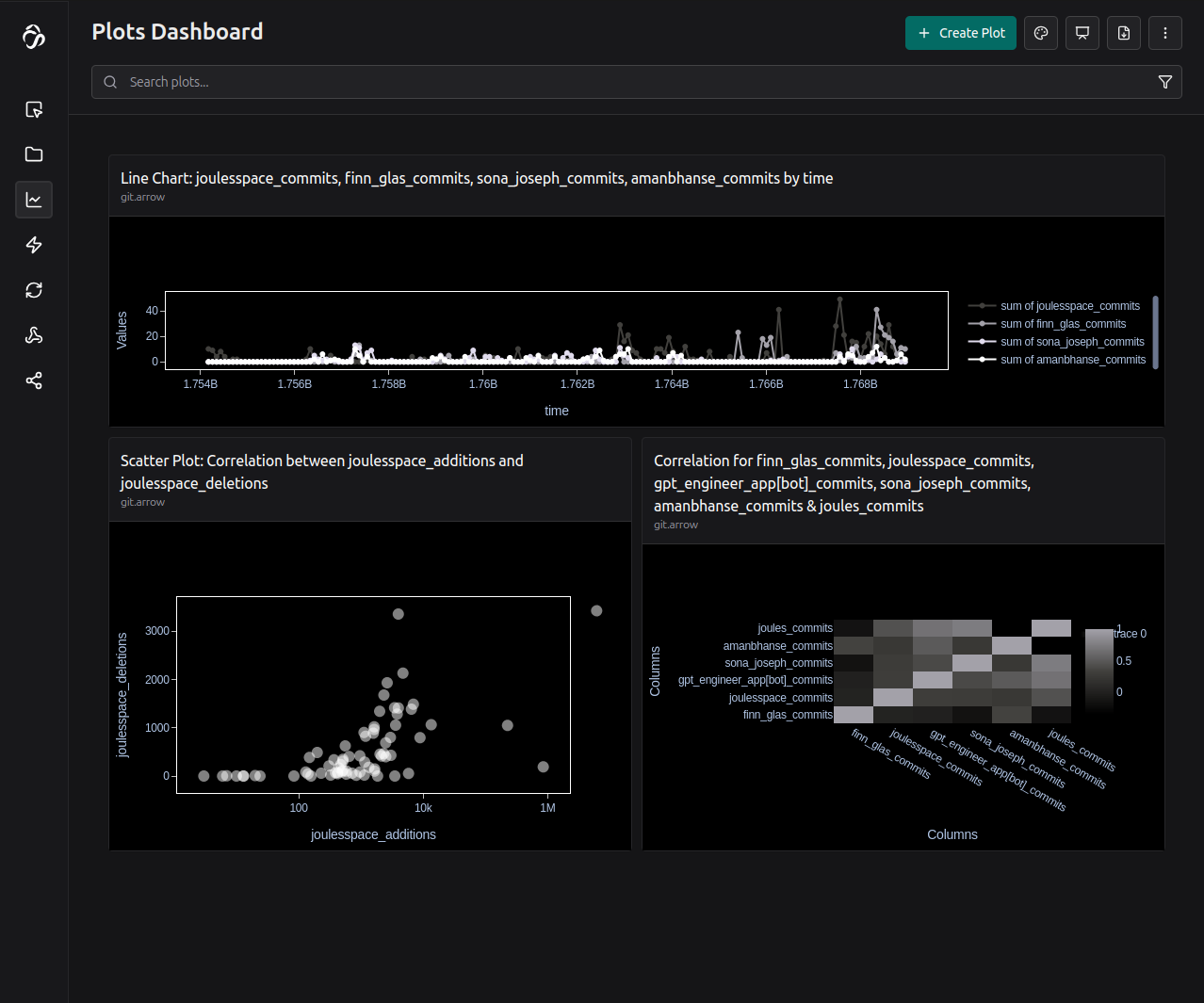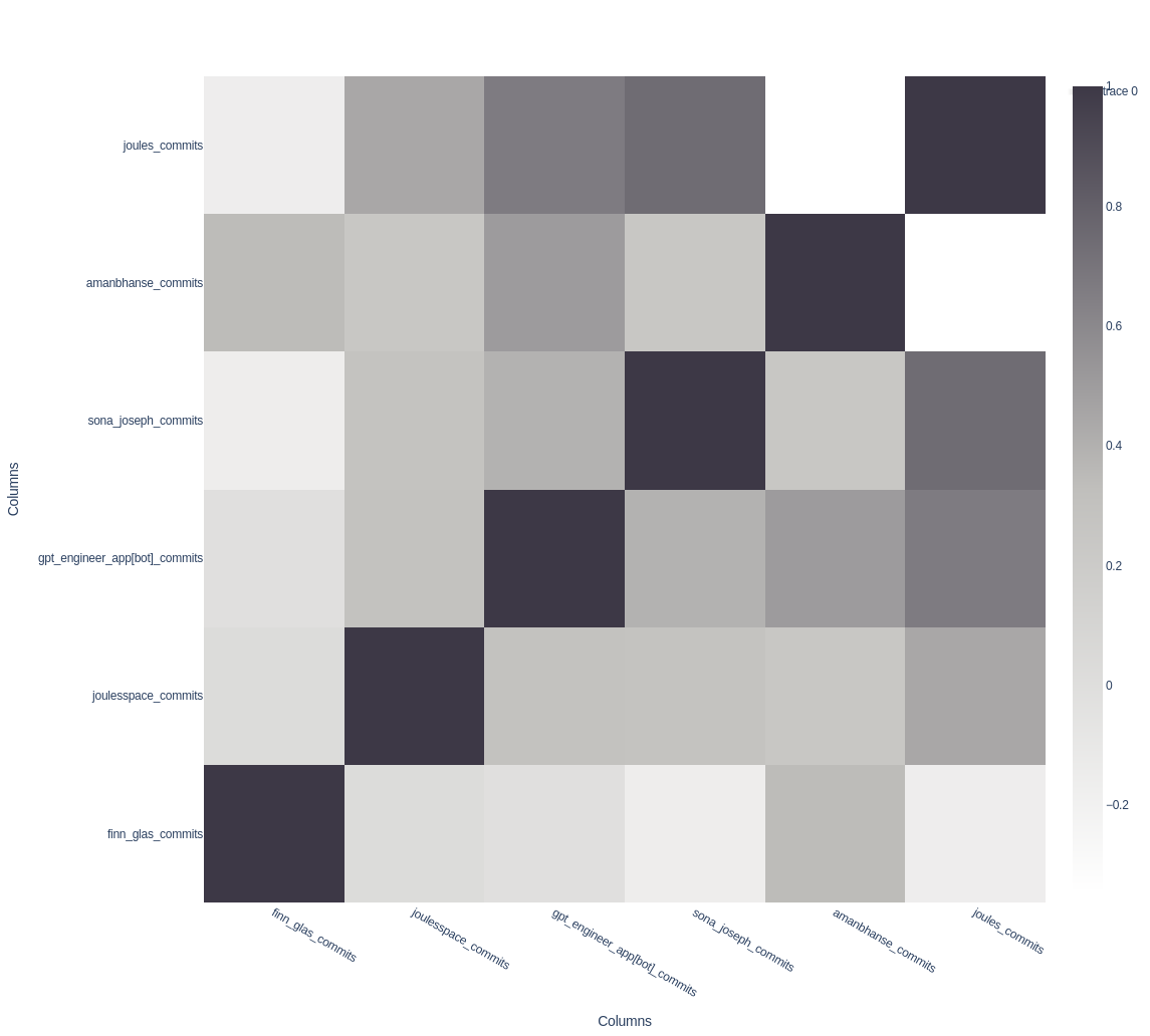 The plot shows the correlation between teammates contributions to the codebase. To the right, you see the black-and-white scale ranging from slightly below 0 (not correlated / inversely correlated) to 1 (meaning exactly equal workload). If you check the gpt-engineer row, you can see it is correlated with every team member except Finn. This is because he did not like the tool and thus did not use it. Aman and Finn seem to have a high correlation, as well as well as Sona and Joules (Julias github account). That "Joules" is Julias github account results in the correlation of the daily commit counts on the two.