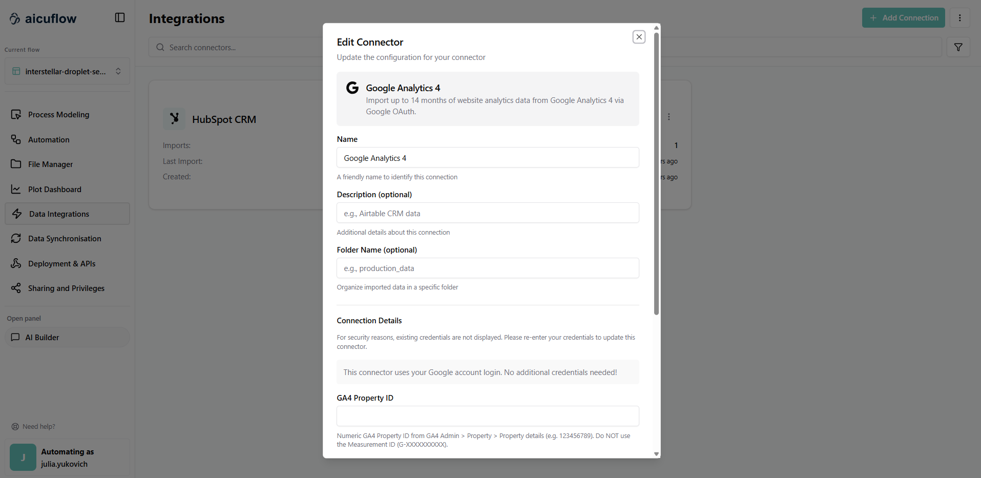 - Name: Give your connector a descriptive name (e.g., "Google Analytics Production")