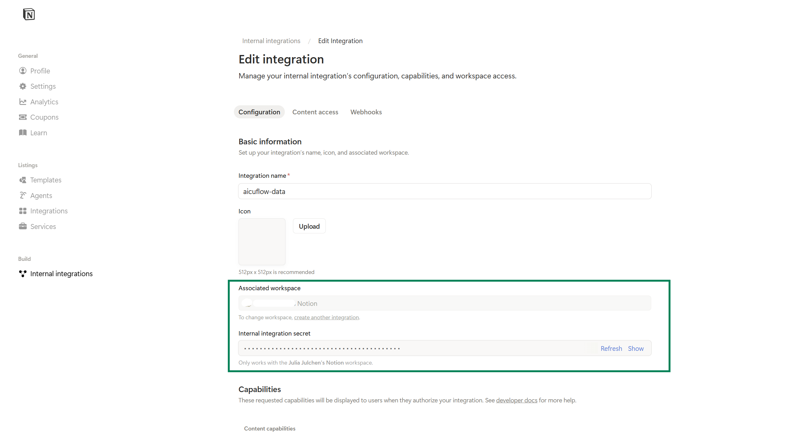 - Create a new integration, give it a name, and select your workspace
