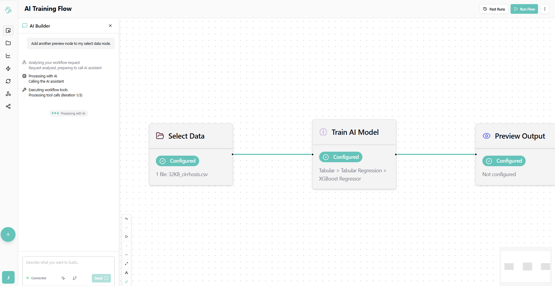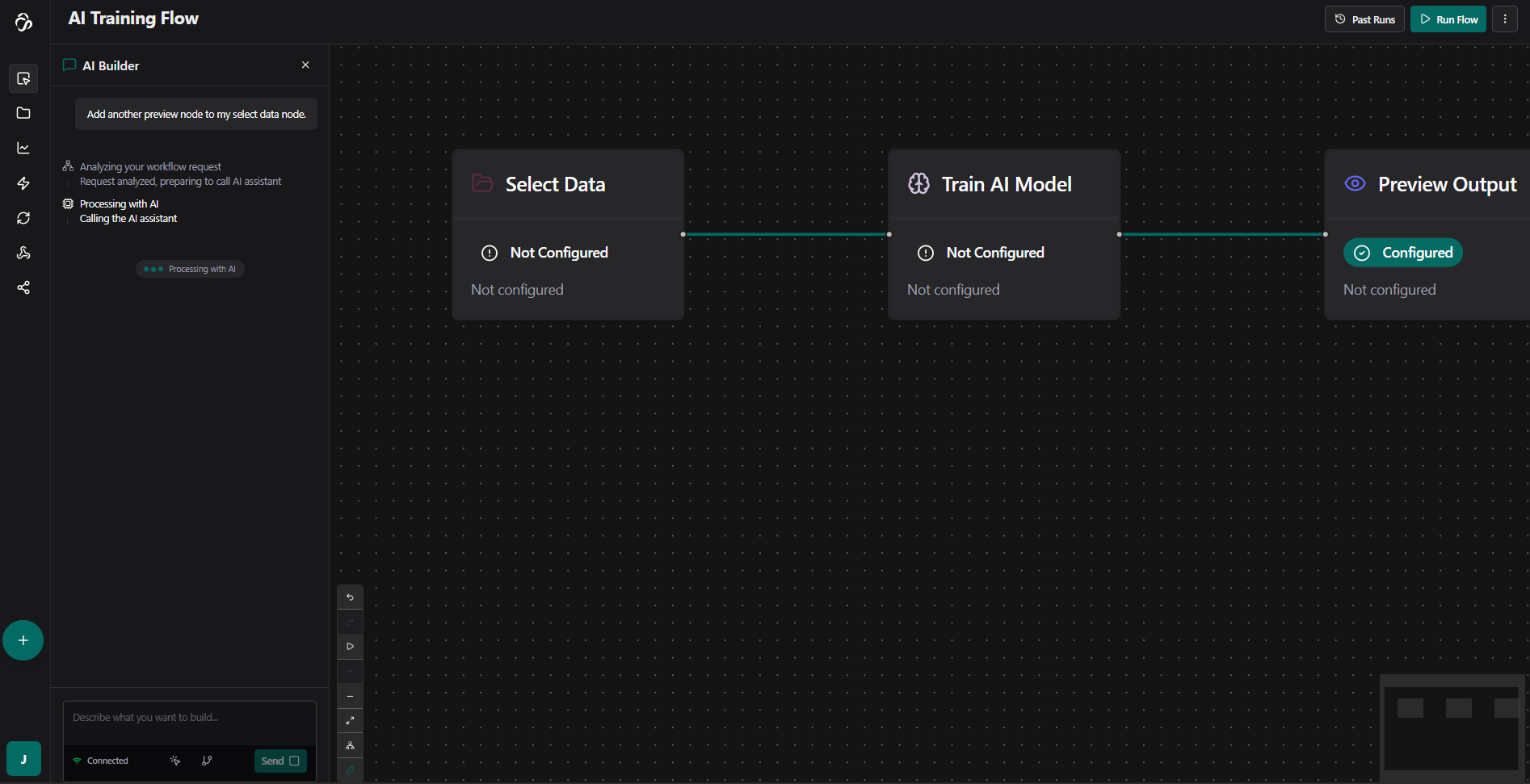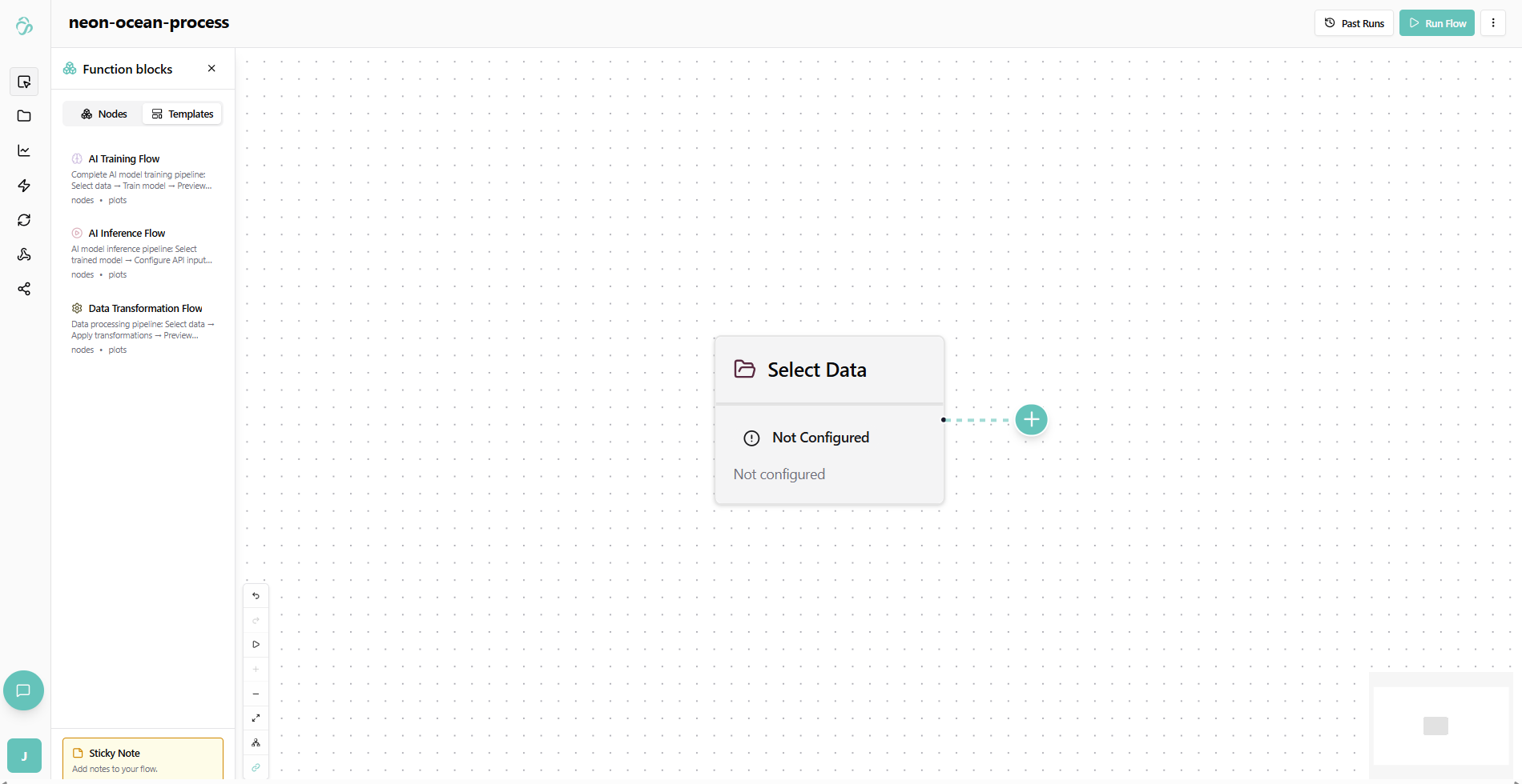 The Flow Editor is a visual, no-code/low-code tool for building powerful data pipelines and automation workflows. With pre-built blocks and AI assistance, you can create complex data processing and AI workflows without writing code.
