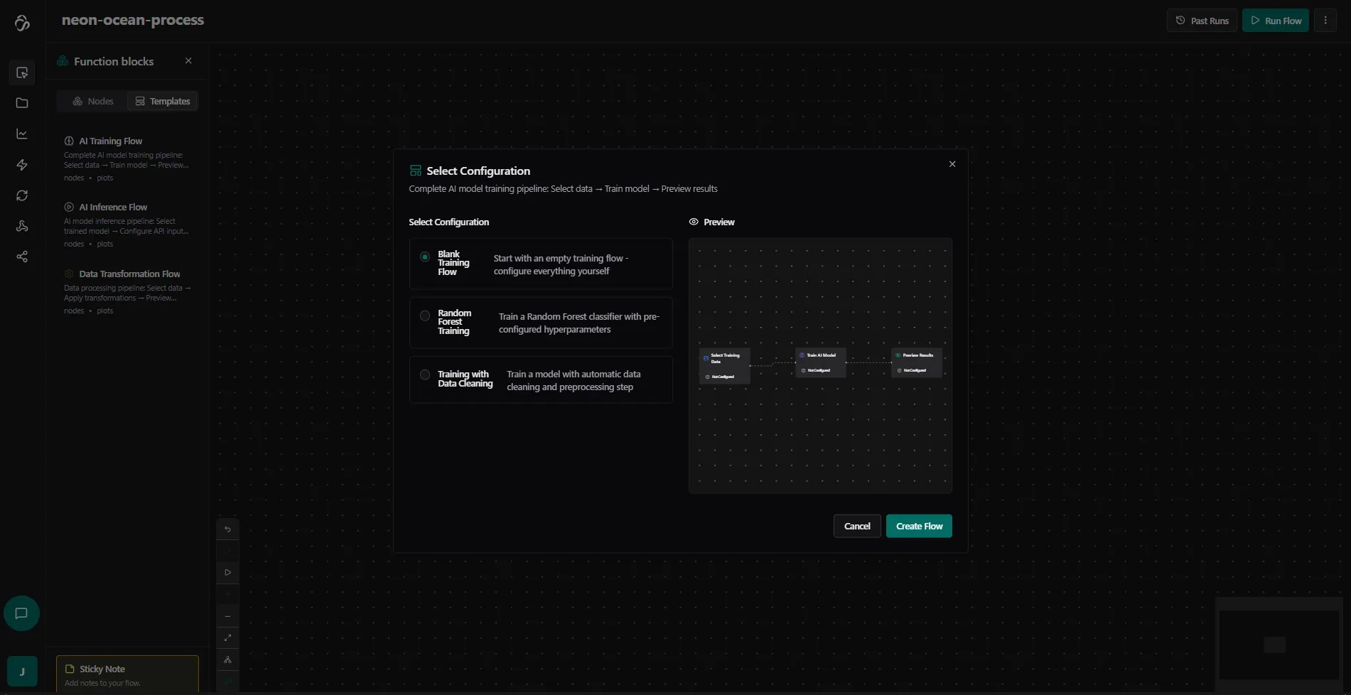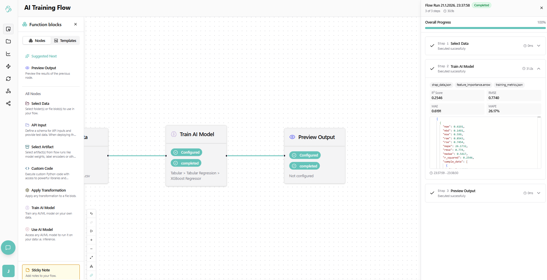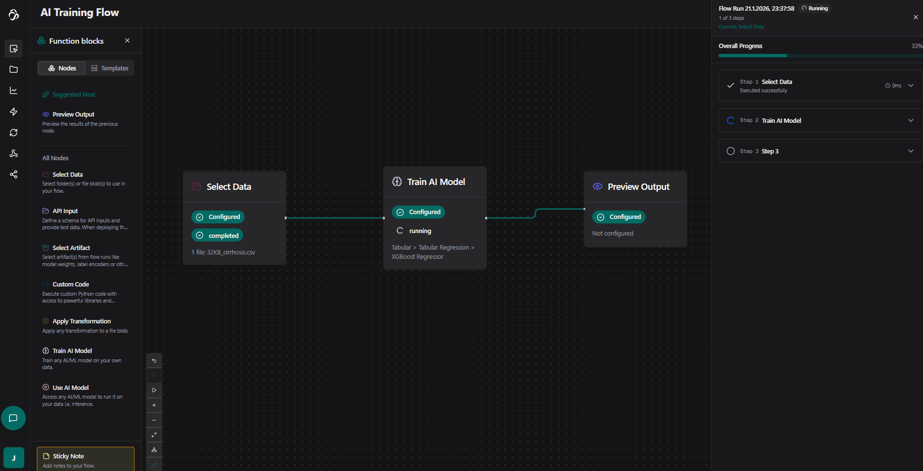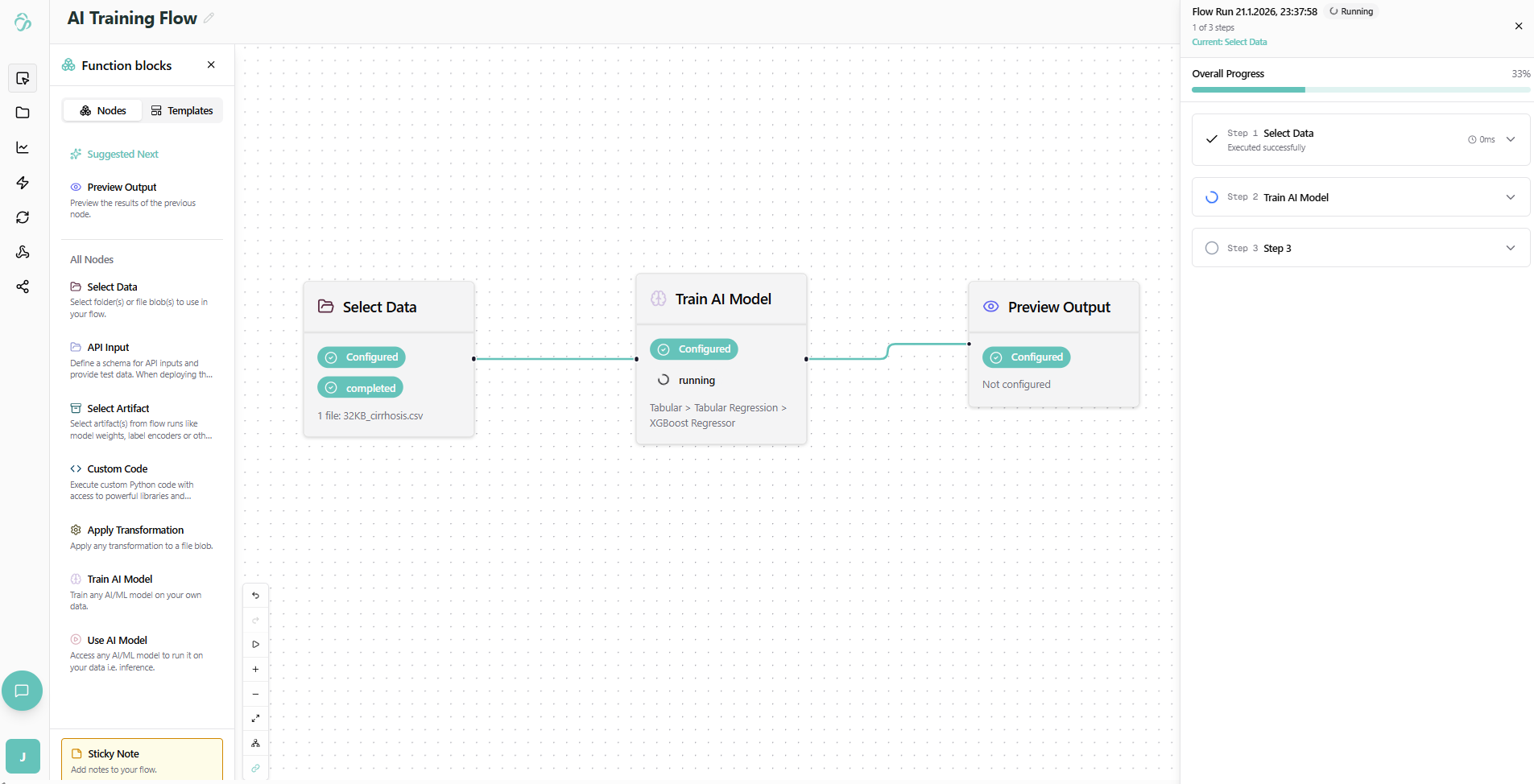 The Flow Editor is a visual, no-code/low-code tool for building powerful data pipelines and automation workflows. With pre-built blocks and AI assistance, you can create complex data processing and AI workflows without writing code.