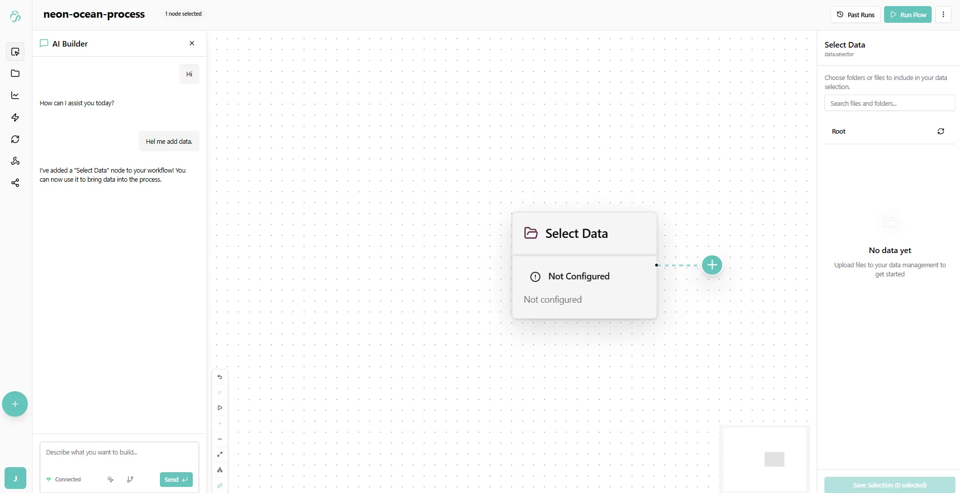In our case we asked the chat (with a typo) if our ai builder can help us add data. The chat suggested to first add a select data node.
