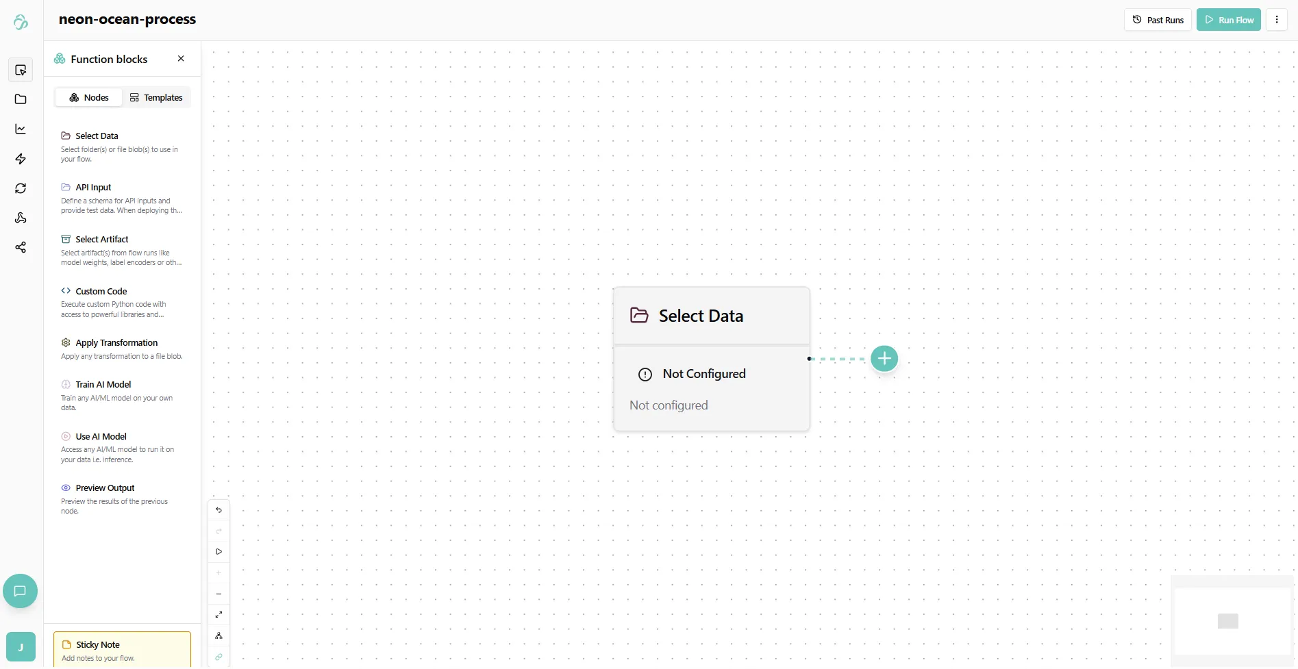 To do this manually you can open the Node Library by clicking on the Plus Icon in the Sidebar and click on the Select Data node. You can also drag the Select Data Node on the canvas. In this node (or function block) we will select what data that we use in our flow. You can add multiple select data nodes and bring the different paths together later or create other structures that you need for your project. All functions that connect to the Select Data Node will use its data.