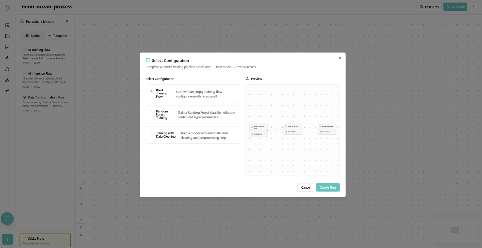 We now decide for a training template. When you click on it a popup appears that shows you the different settings that a template can have. We usually have a blank template that gives you only the most basic nodes. Some templates offer ready made settings for different models that we recommend or will allow you some extra steps or even provide example datasets you can use to experiment with or exchange with your own. Make sure to read the instructions carefully. Depending on your subscriptions you have access to different templates.