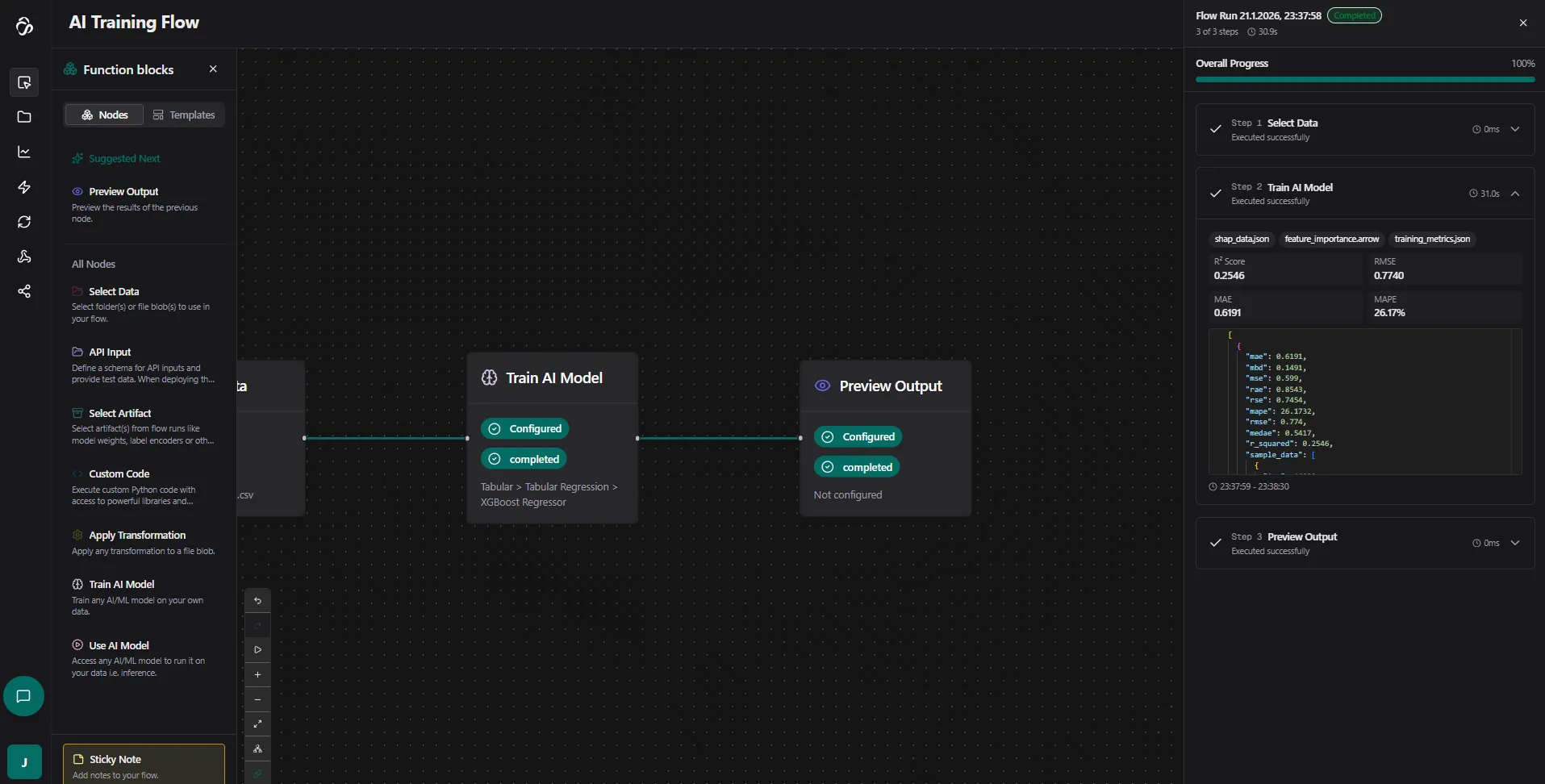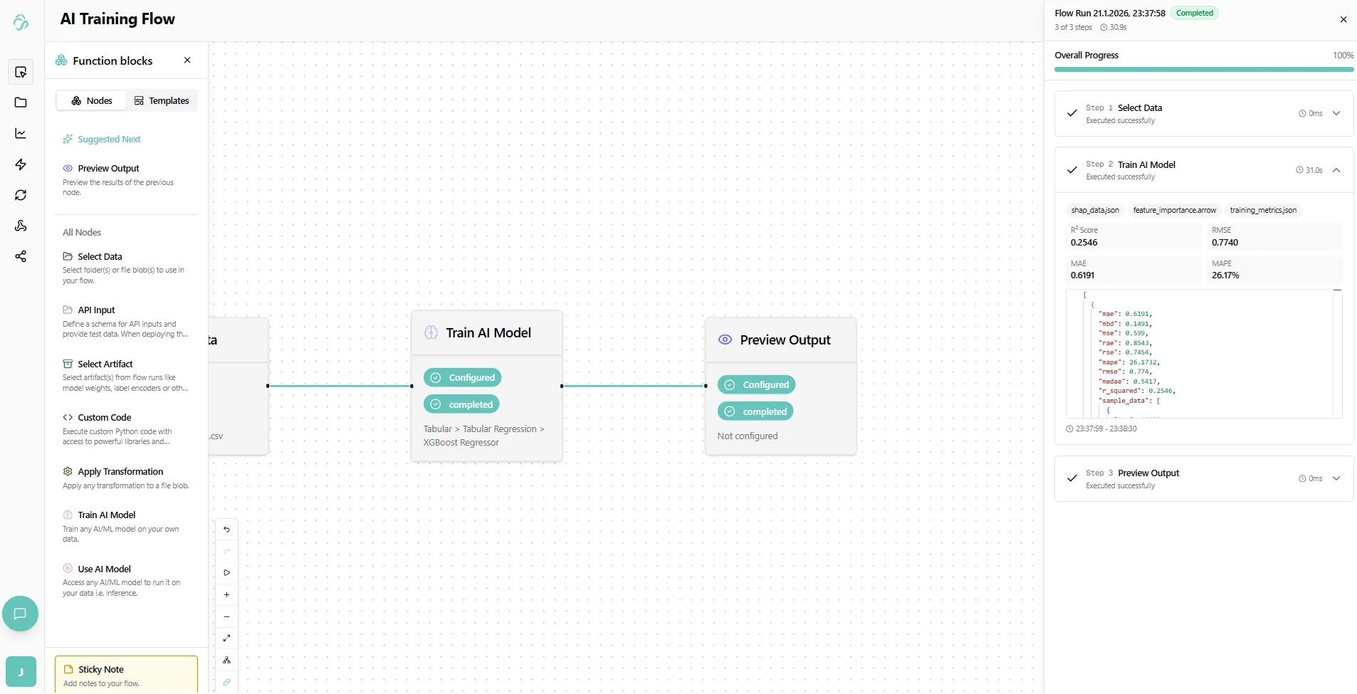 In the results you will see node specific outputs in a json format. If you connect a preview output node then these will be converted to plots, images, json structures and files that you can download or view.