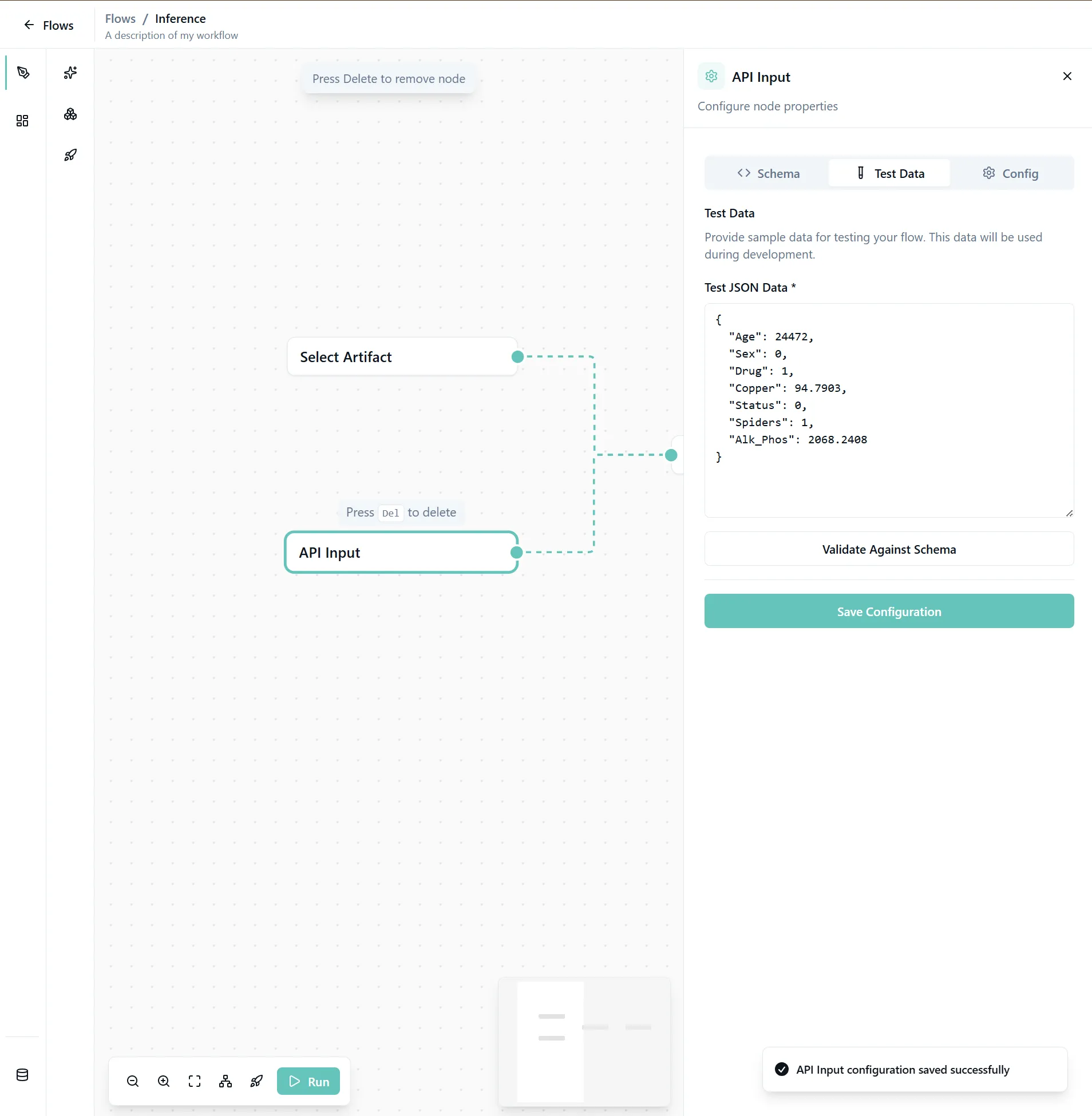 The API Input node defines the structure of data you'll send to the model for predictions.