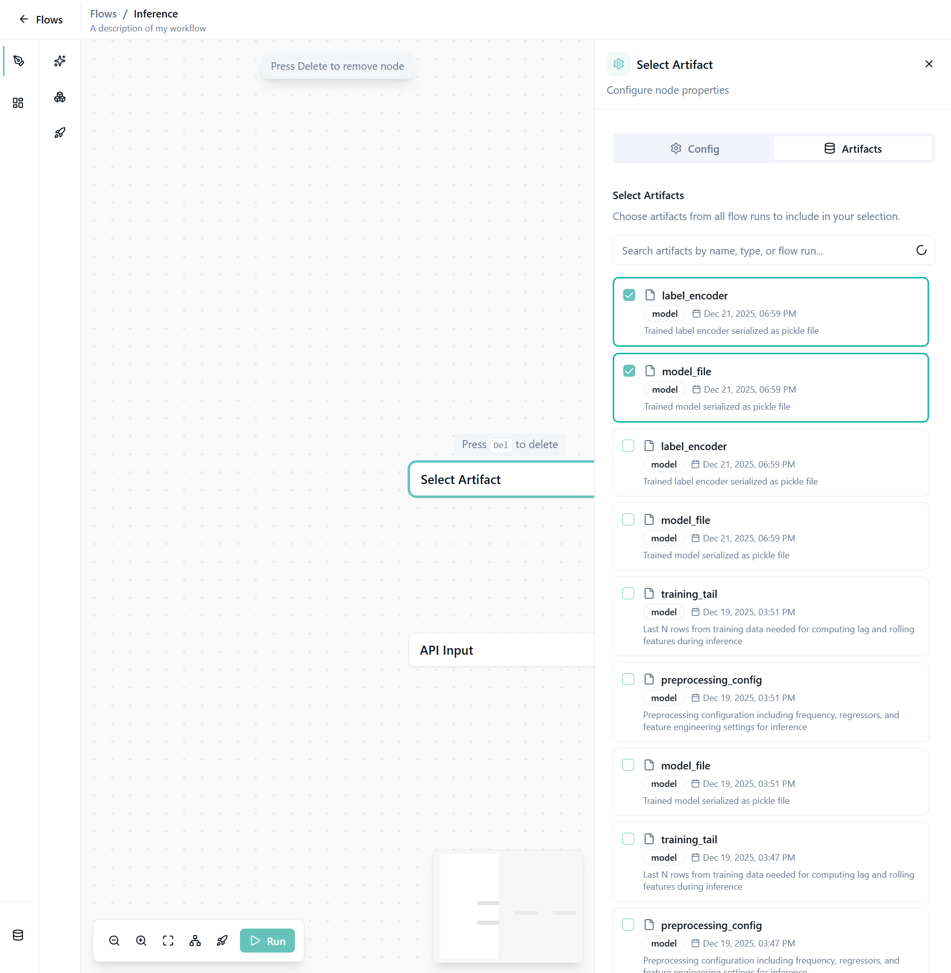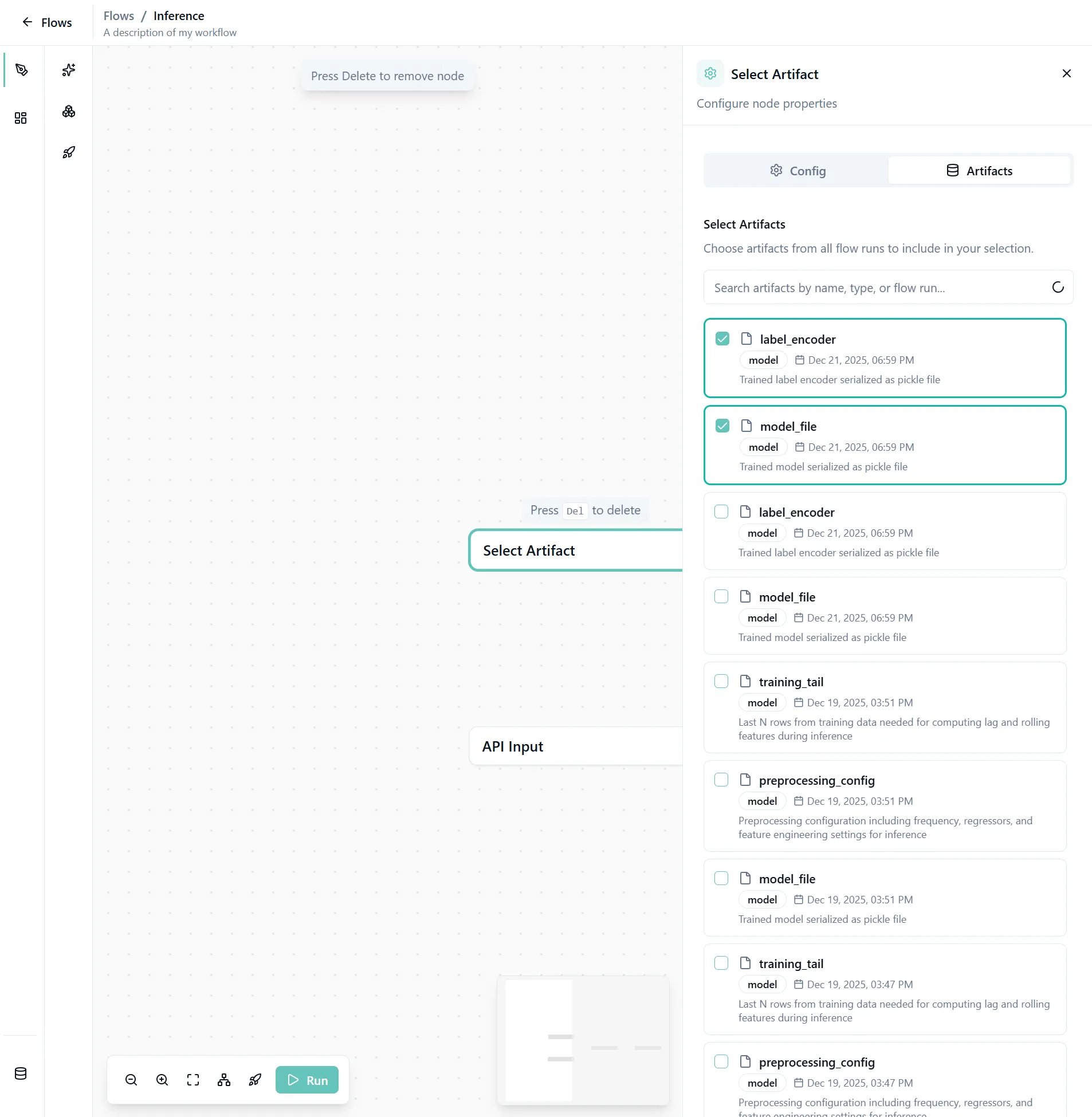 Click on the Select Artifact node and open the Artifacts tab. Choose the artifacts you want to use with the AI model for inference.
