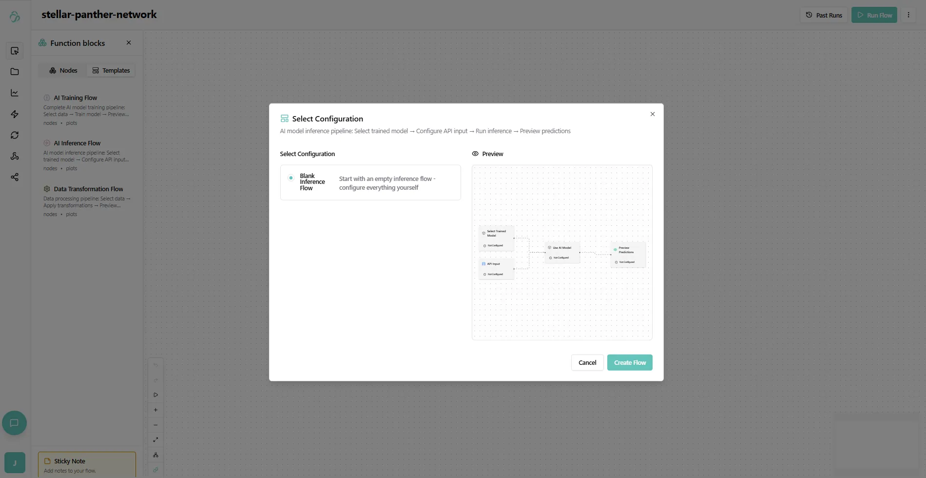 Alternatively you can add them in the chat or from an inference template. Simply select the node library, navigate to the template tab and select Ai Inference Flow. Here we are choosing the blank flow.