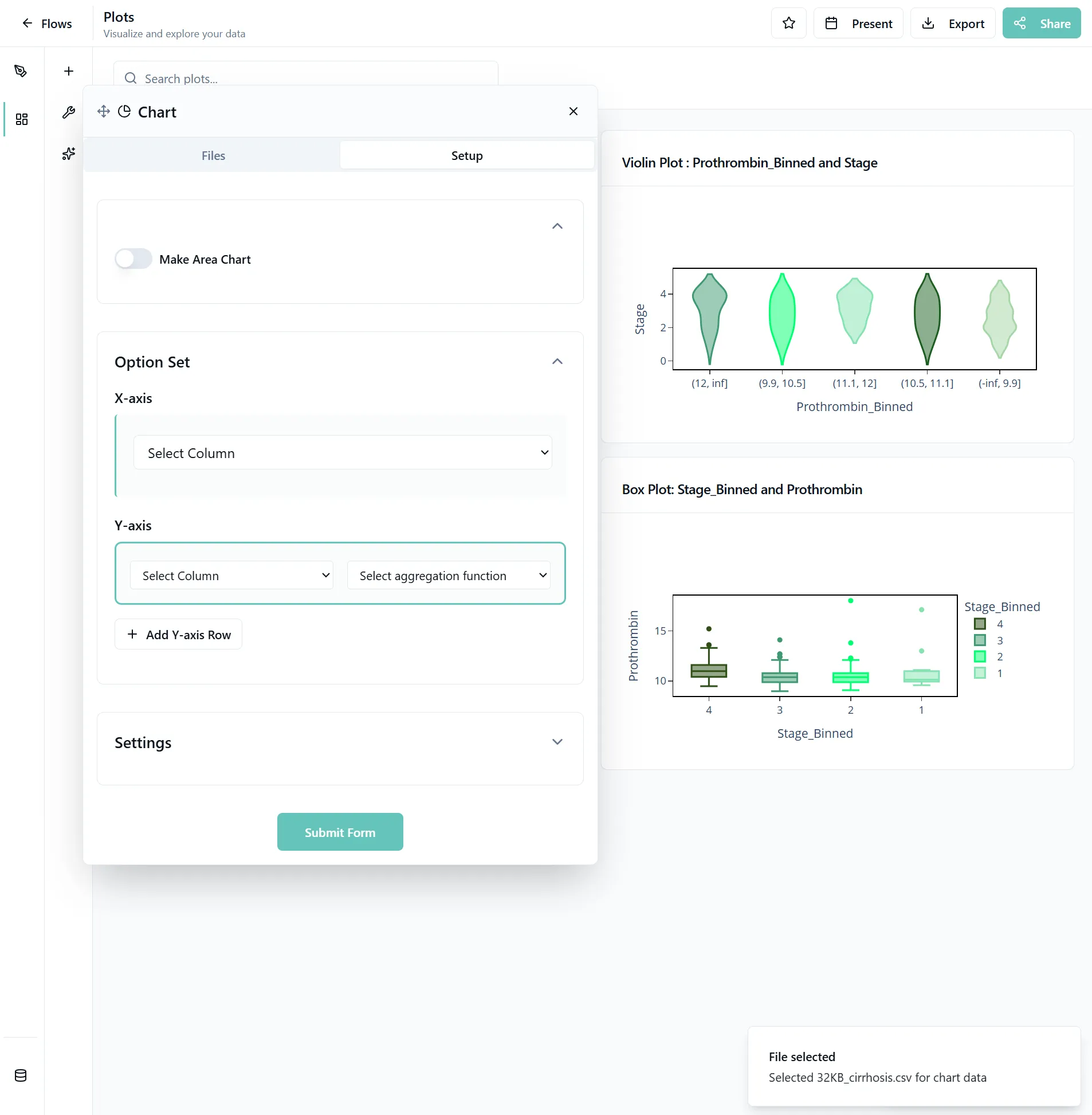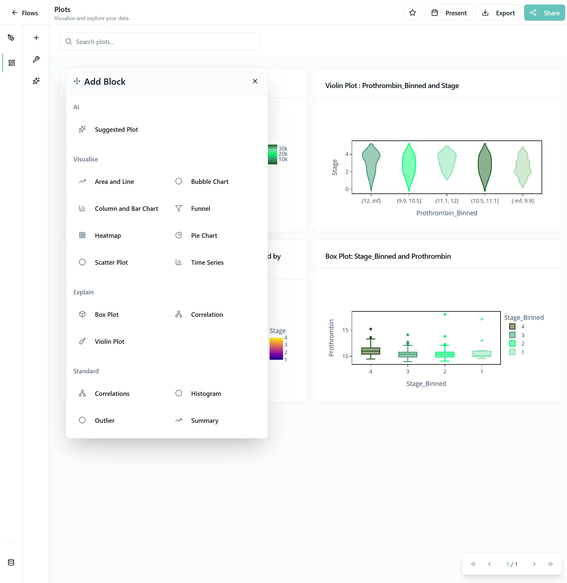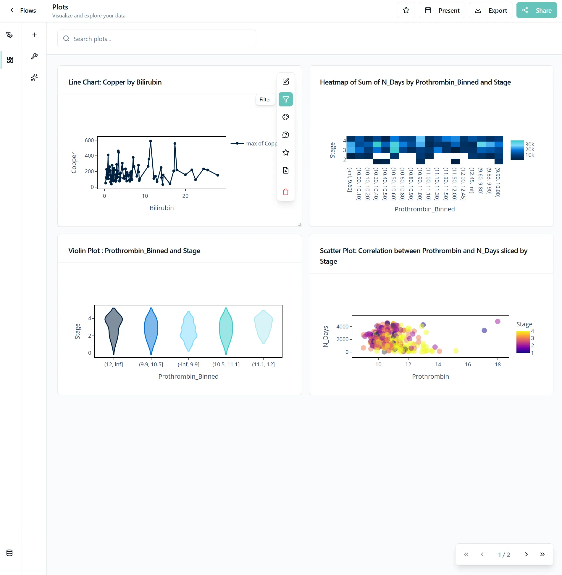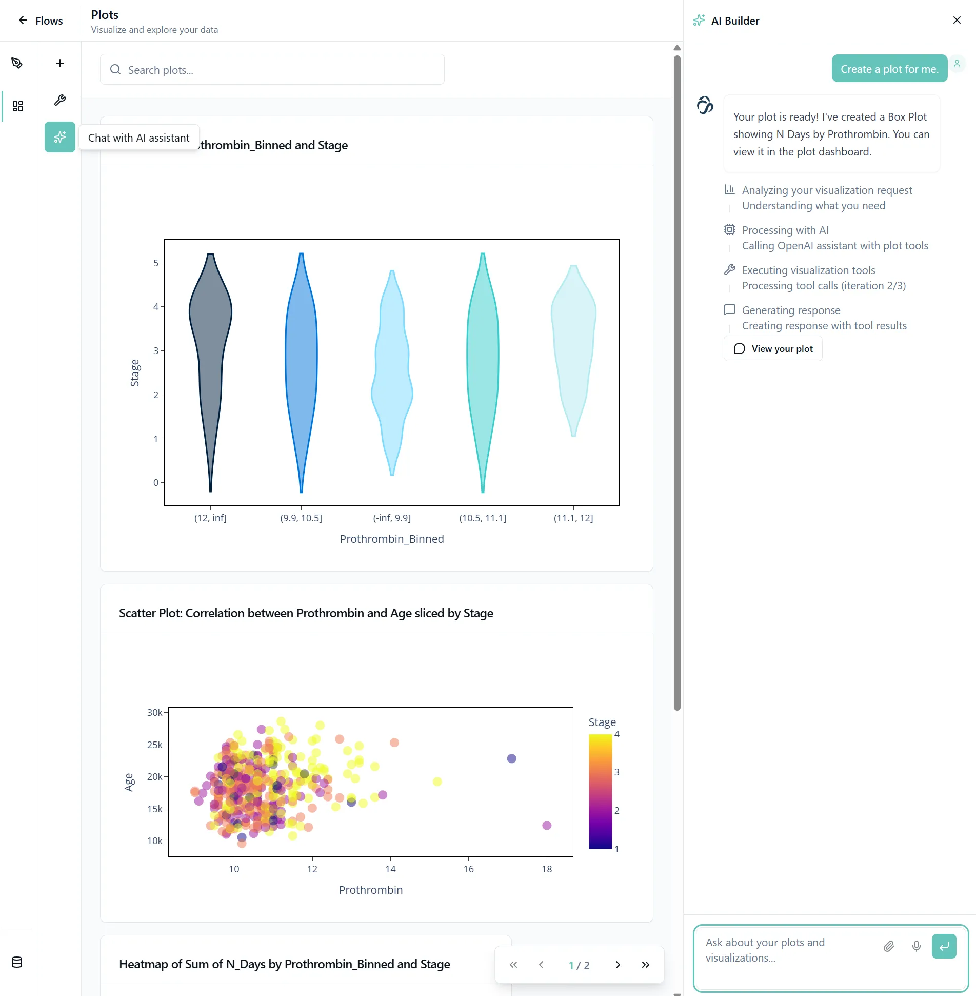 Your data gets pretty with interactive visualizations. In the background we do teh math and statistics for you to recommend teh most suitable plots. You can also activate AI agent support that runs an LLM to have a flawless experience.