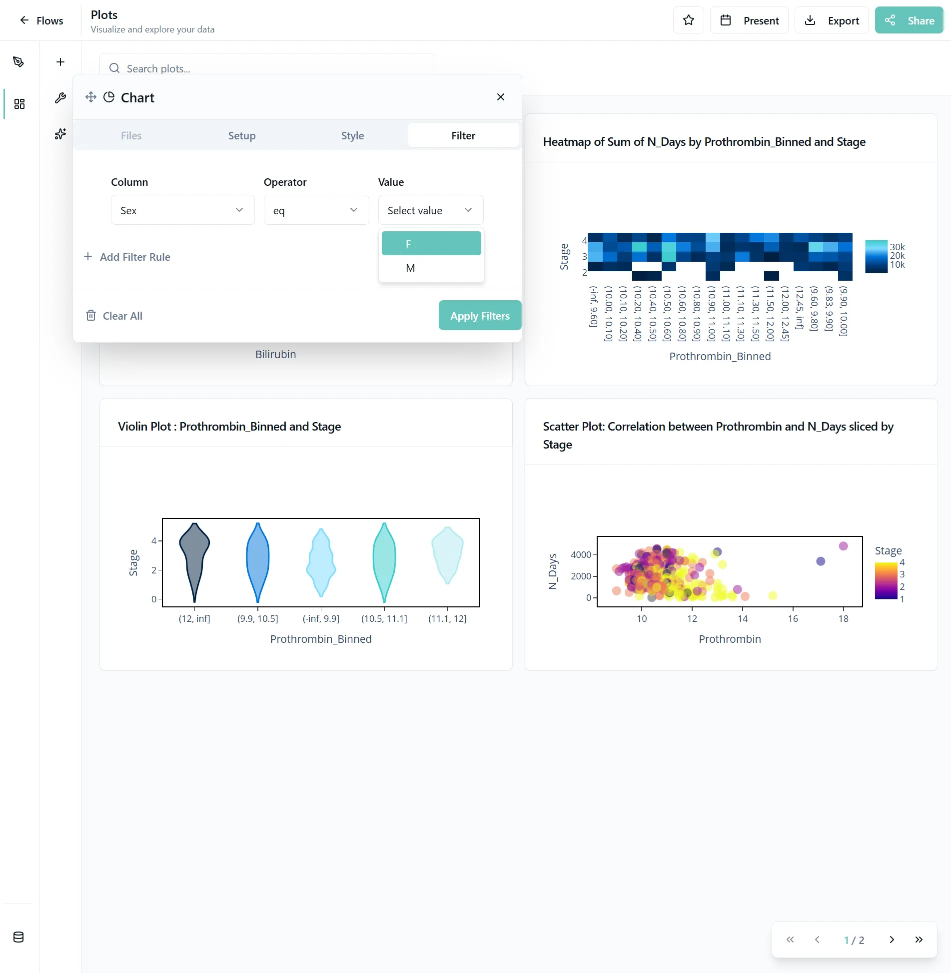 Apply filters to focus your analysis on specific data subsets. For example, to filter for female participants, hover over the plot and click on the filter icon.