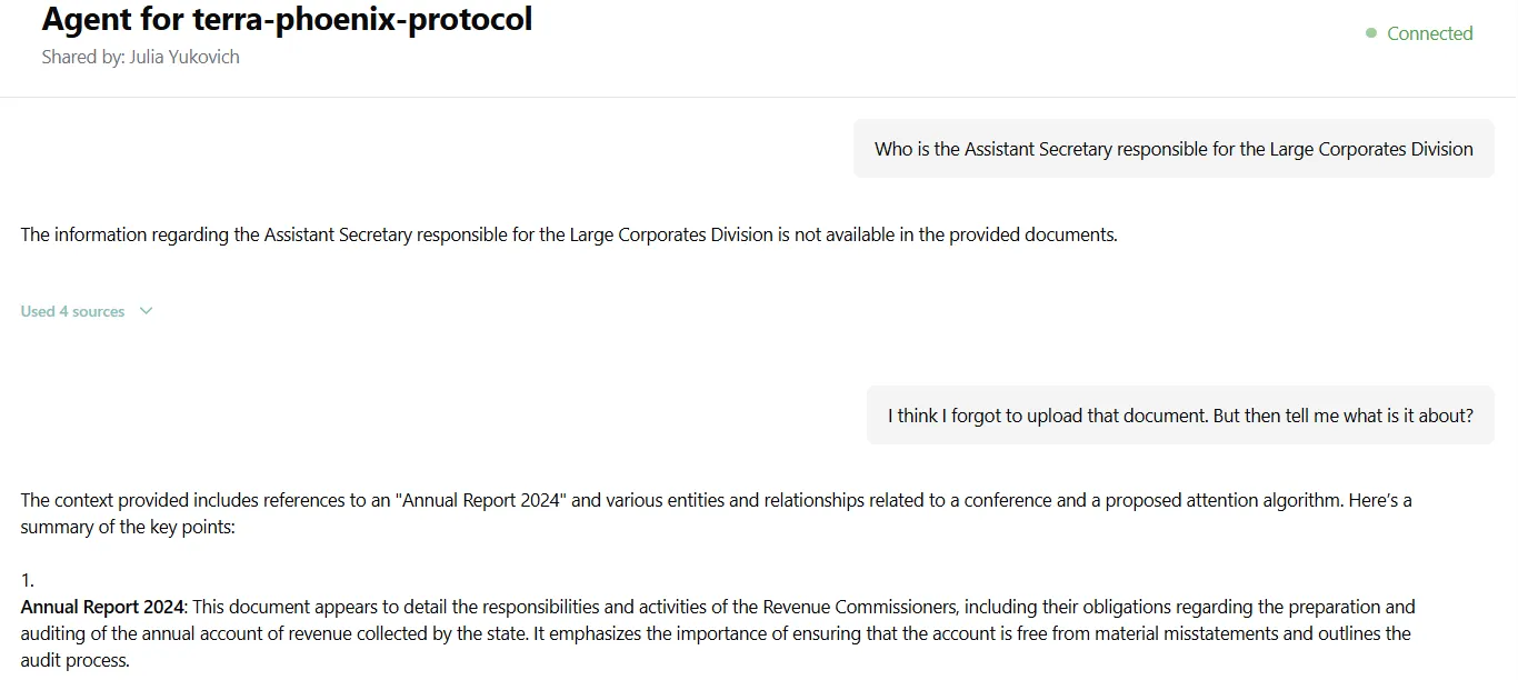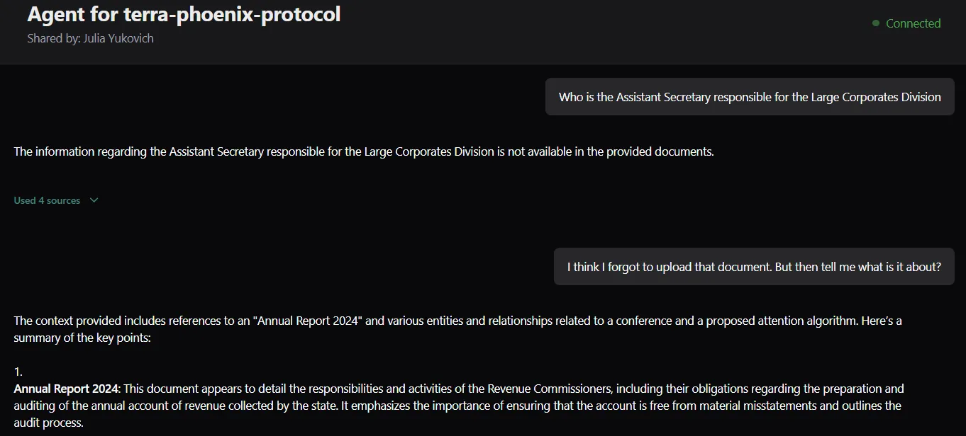 Every RAG index automatically builds a Knowledge Graph — a network of entities and relationships extracted from your documents. This lets you visually explore what your documents contain before and while asking questions.