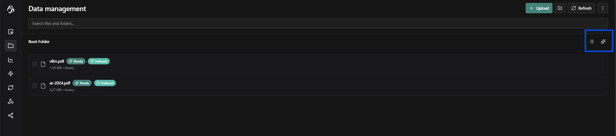 Click the RAG icon (✦) in the top right of the File Manager to open the knowledge graph and chat interface.